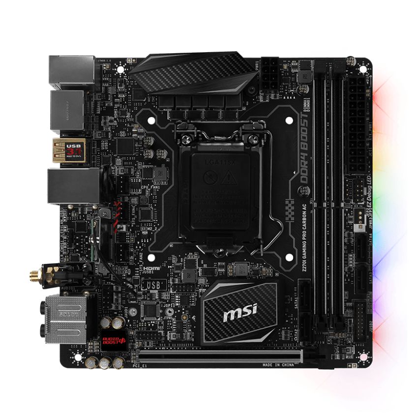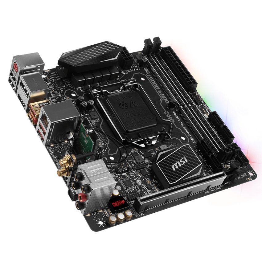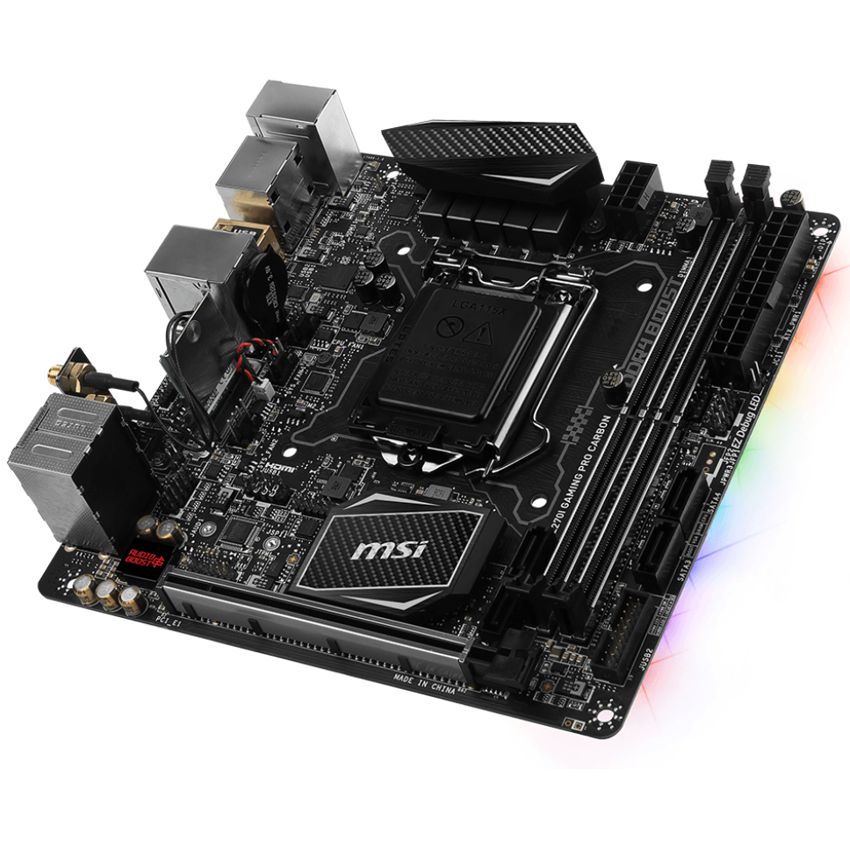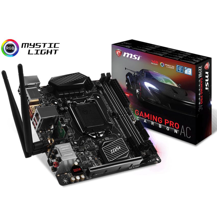 Descripción MSI Z270I Gaming Pro Carbon AC. tipos de memoria compatibles: DDR4-SDRAM, Tipo de ranuras de memoria: DIMM, Canales de memoria: Dual. Familia de procesador: Intel, Procesador compatible: Celeron, Core i3, Core i5, Core i7, Pentium, Socket de procesador: LGA1151. Controlador LAN: Intel I219-V, Tipo de interfaz ethernet: Gigabit Ethernet, Wi-Fi estándares: IEEE 802.11a, IEEE 802.11ac, IEEE 802.11b, IEEE 802.11g, IEEE 802.11n. Componente para: PC, Familia de componentes de tarjeta madre: Intel, Circuito integrado de tarjeta madre: Intel Z270. Tipos de BIOS: UEFI