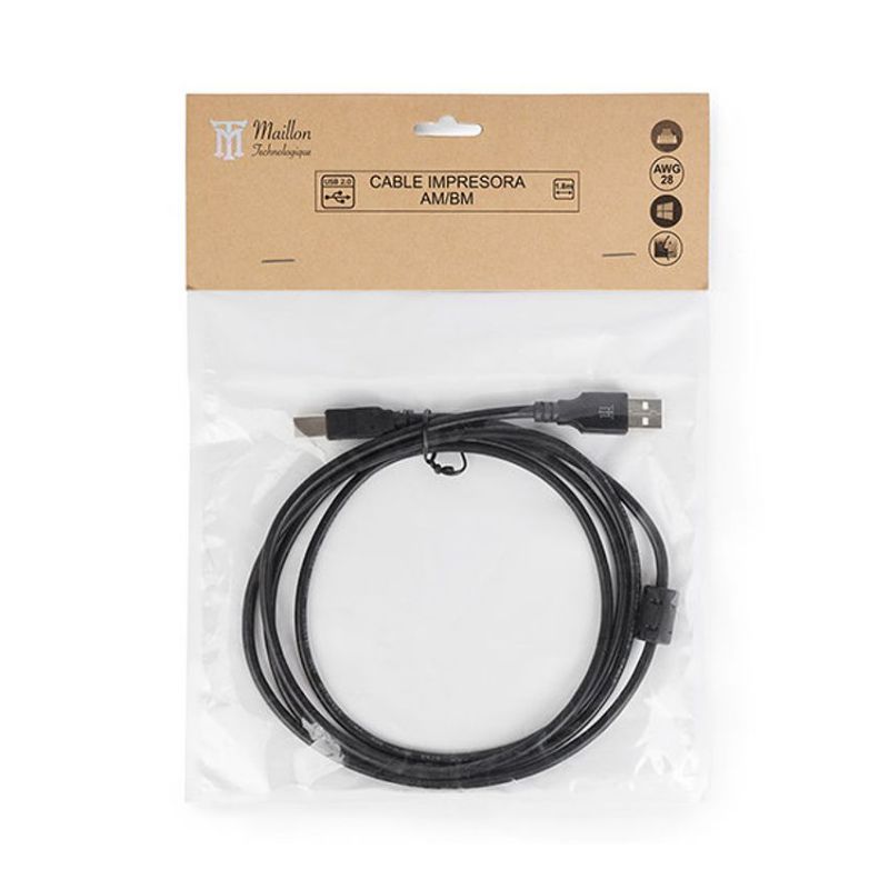Descripción Maillon Technologique Basic MTBPRB2018. Longitud de cable: 1,8 m, Conector 1: USB A, Conector 2: USB B, Versión USB: USB 2.0, Rango máximo de transferencia de datos: 480 Mbit/s, Contactos del conector chapado: Níquel, Color del producto: Negro