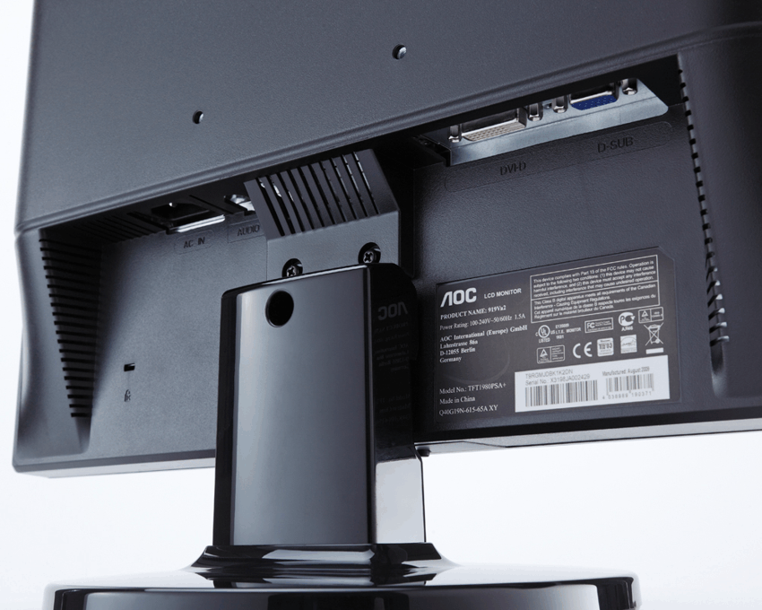 AOC 919Vz. Tamaño de pantalla en diagonal: 482.6 mm (19 "), Brillo de pantalla: 250 cd / m², Resolución de la pantalla: 1280 x 1024 Pixeles. Ranura para cable de seguridad Kensington: Kensington. Ángulo de inclinación: -5 - 20 °, Montaje VESA: 100 x 100 mm. Consumo de energía (inactivo): 2 W, Consumo energético: 45 W, Modo de suspensión: 1 W. Certificados: cUL, FCC, CE, TUV-bauart, TCO03, ISO13406-2, Windows Vista premium, GOST, RoHS
