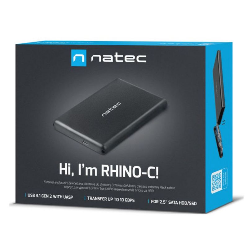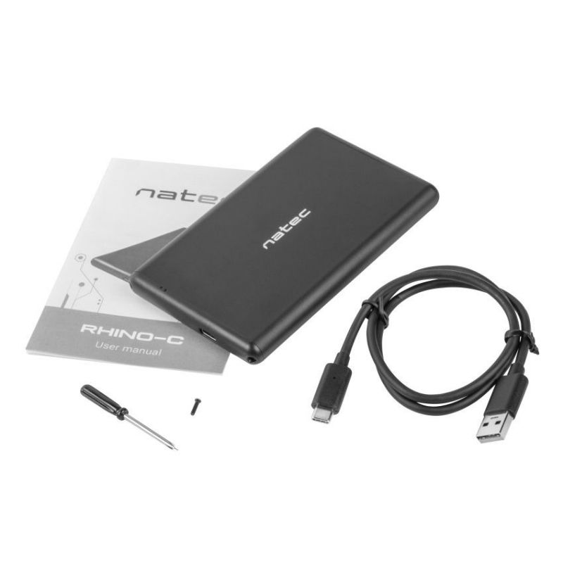 Descripción Natec Genesis RHINO-C. Tipo de producto: Carcasa de disco duro/SSD. Número de unidades de almacenamiento compatibles: 1, Tamaño de la unidad de almacenamiento: 2.5", Interfaces de disco de almacenamiento soportados: Serial ATA III. Velocidad de transferencia de datos: 6 Gbit/s. Color del producto: Negro. Conector USB: USB Tipo C