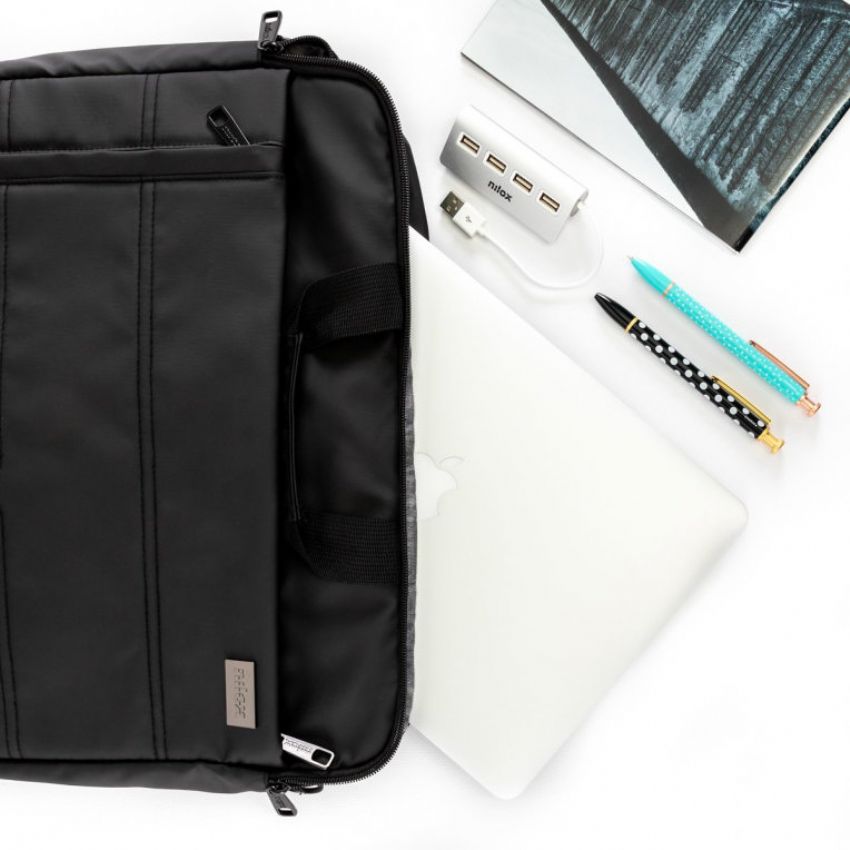 Descripción - Maletín para portátiles de hasta 15.6 " de color negro. Sus tres amplios compartimentos te permitirán llevar contigo tu laptop y todos los accesorios que necesites para tu trabajo de manera ordenada. - En Nilox cuidamos los detalles, por eso hemos diseñado esta línea de maletines con un diseño actual, fino y elegante, en distintos colores para que puedas elegir el tuyo. El interior del maletín va forrado con trama de logos, mientras que el exterior es 100% polyester con el logo en metal. - Su cremallera reforzada y su diseño sólido te permiten proteger los elementos esenciales de tu portátil - Incluye correa para que lo puedas trasportar en modo bandolera - Material Poliester . - Bolsillos para guardar accesorios. - Cinta para Trolley - Interior gris con trama de Logos. - Cremallera metal en negro.