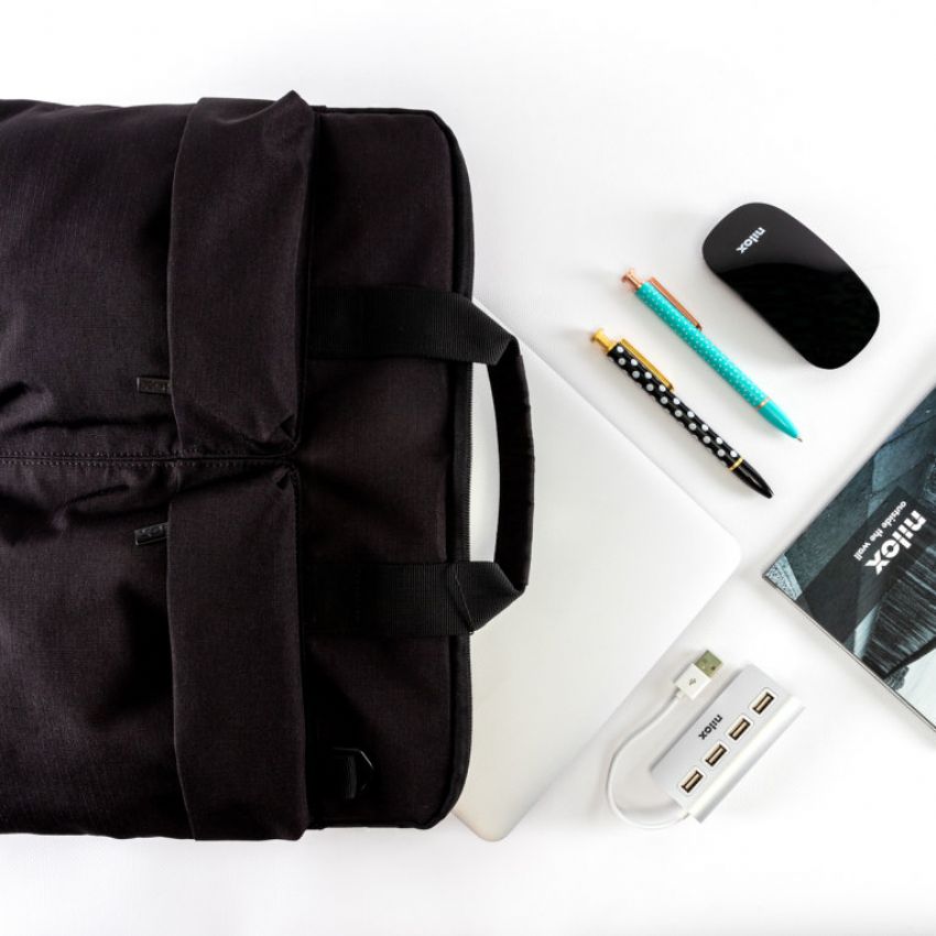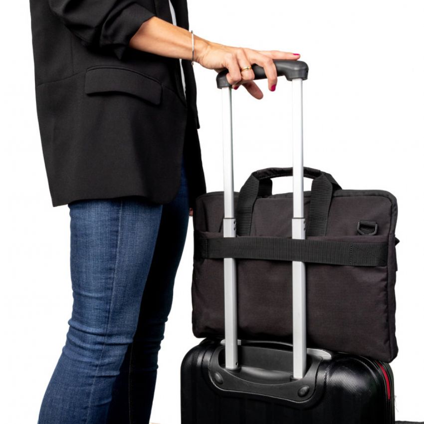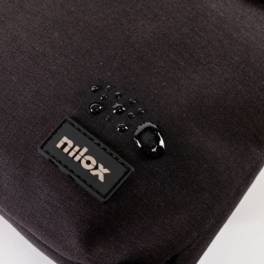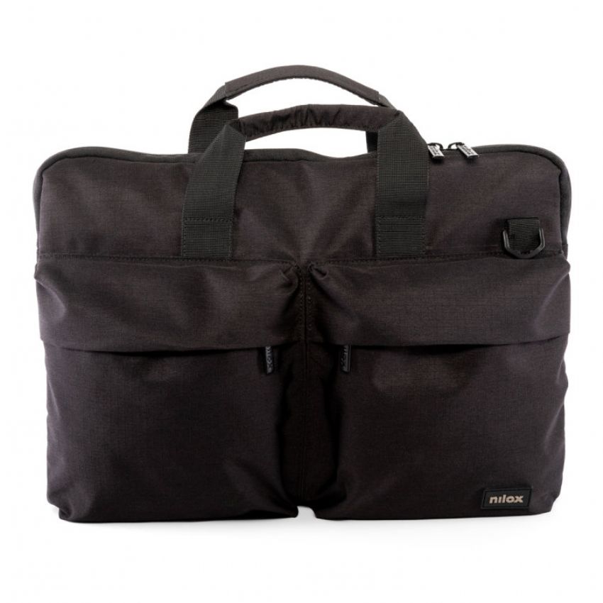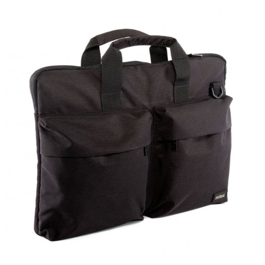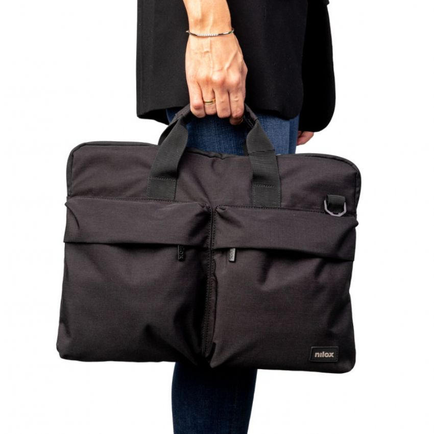 Descripción - Maletín Nilox para ordenador portátil de 15.6 pulgadas de alta calidad: De material impermeable para evitar que el agua traspase poniendo en peligro el contenido. - Contiene 3 compartimentos en los que distribuir tus pertenencias. El bolsillo principal es para el ordenador, mientras que los bolsillos exteriores son para colocar cables, ratón, pendrives, teléfono, bolígrafos etc, y así tener todo perfectamente organizado. - Diseño elegante y original. - Cinta Trolley en la parte trasera. - LOGO en Rubber. Gris sobre negro. - Interior gris con trama de Logos. - Cremallera metal en negro.