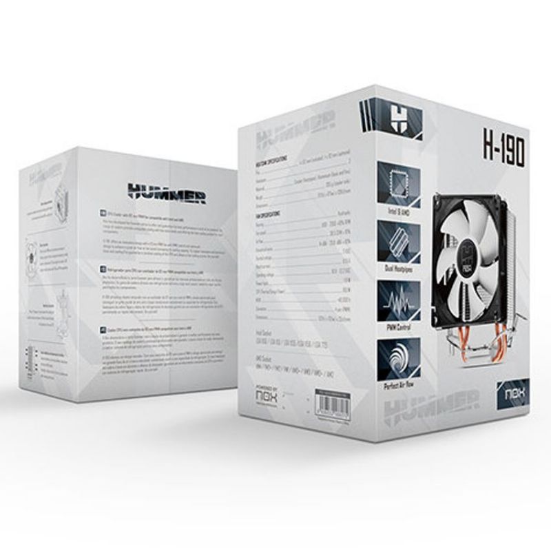 Descripción Nox amplía su serie Hummer con el cooler H-190, compatible con Intel y AMD y con control PWM. Mediante un ventilador de 92 mm acoplado a un disipador con heatpipe doble de cobre, H-190 logra un silencioso y potente flujo de aire a baja velocidad, siendo una solución altamente versátil gracias a su socket universal.