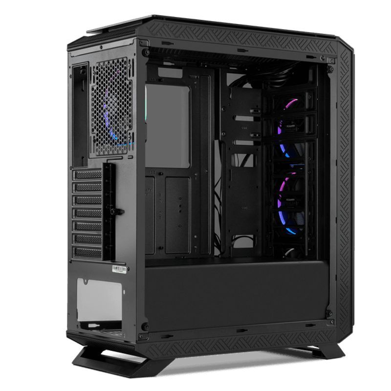 SISTEMA DE VENTILACIÓN Para refrigerar de manera eficiente todos los componentes de nuestra configuración, Hummer TGF cuenta con capacidad para instalar hasta seis ventiladores. En su panel frontal incluye tres ventiladores de 120 mm con RGB Rainbow, uno en su panel trasero también de 120 mm con RGB Rainbow pero además es posible instalar dos ventiladores más de 120 mm o 240 mm en su panel superior. Además, cuenta con rejillas en su frontal que permitirán que el aire frío entre en el interior del PC que se expulse por sus rejillas superiores.