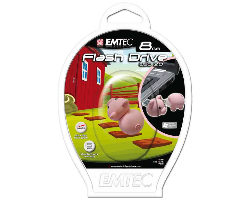 Características Atal Velocidad de transmisión de datos Tamaño reducido: 50mm Material en caucho siliconado Su extremo de goma y una pequeña cadena permiten fijar la llave USB para evitar perderlaEspecificaciones técnicas Capacidad 4GB - 8GB Read speed Hasta 15MB/s Write speed Hasta 5MB/s Operating system Windows 98Se, 2000, XP, Me, Vista, 7, Linux, Mac OS Compatibility Compatible con todo tipo de equipo USB 1.1 o USB 2.0 Garantía 5 años Dimensiones del producto Vaca : 21 x 23 x 45mm / Cerdo : 21 x 24 x 40mm / Gallina : 40 x 27 x 29mm / Conejo : 46 x 22 x 19mm Blister dimensions 172 x 122 x 33mm Contenido del paquete Extremo de goma con cadena incluidos