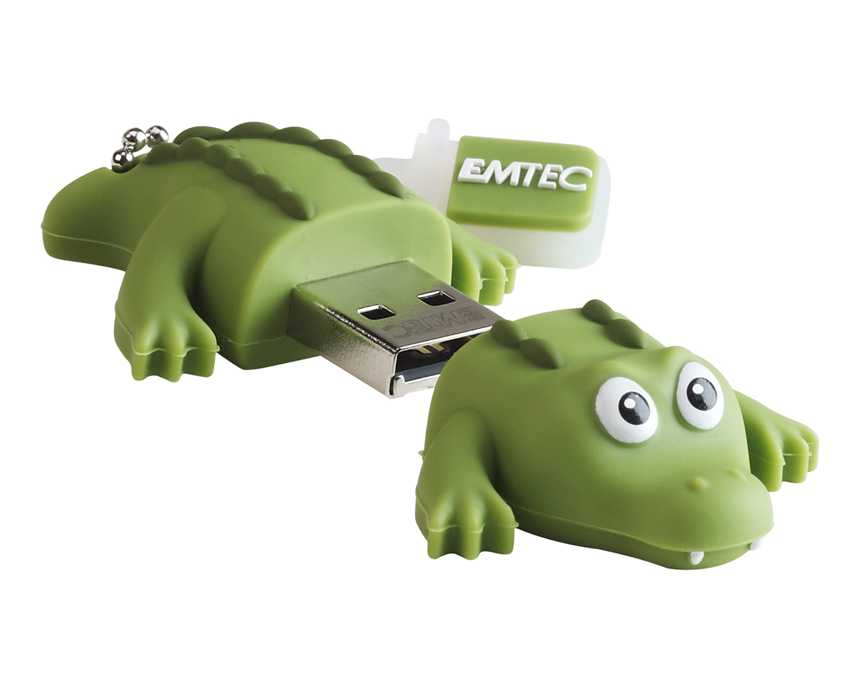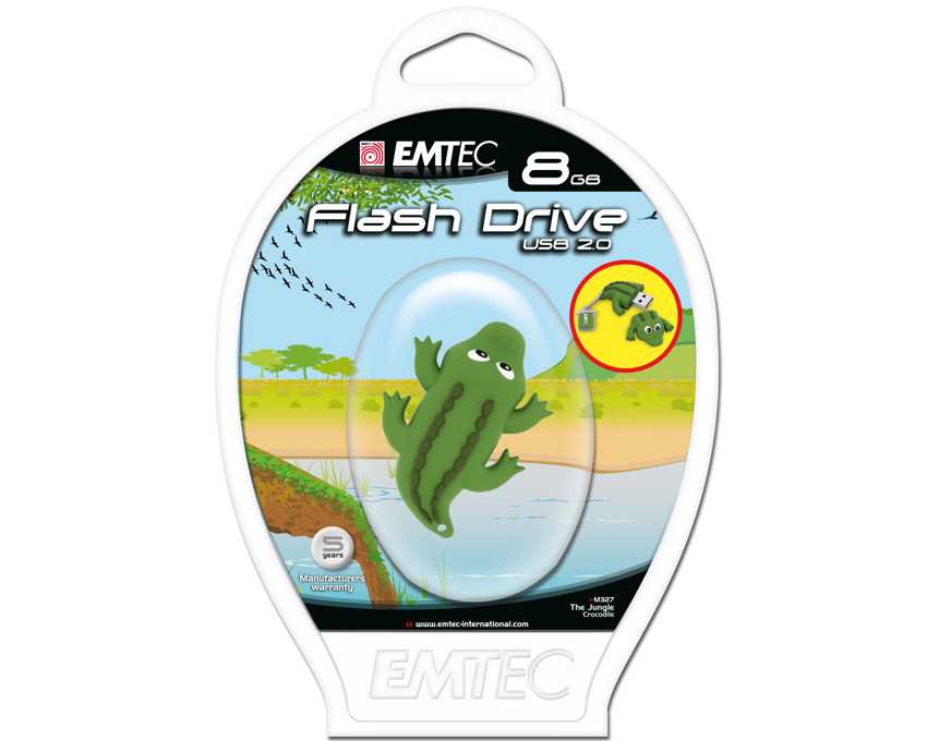 Diseño exclusivo EMTEC Fabricados en goma con tacto de "piel de melocotón" Tamaño mini: ningún animal supera los 50mm Cada memoria cuenta con un extremo de goma suspendido a una cadenita: Lleve a todas partes su animal favorito. Gracias a su cadenita, usted podrá colgar su memoria USB a su llavero o incluso su bolso de mano. No hay riesto de perder una parte de la memoria cuando esta se encuentra conectada: basta con unir las dos partes con el extremo de goma. Capacidad 8GB Read speed Hasta18MB/s Write speed Hasta 8MB/s Operating system Windows 7 – Vista – XP – 2000 - 98Se*, Mac 8.6 - OS 9 - OS X, Linux Compatibility Compatibilidad universal USB 2.0 Garantía 5 años Dimensiones del producto Crocodile: 13x40x52mm Blister dimensions 172 x 122 x 33mm Contenido del paquete Cadena incluída