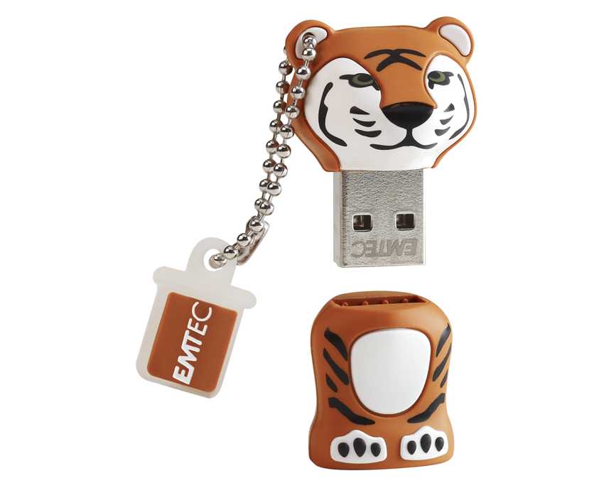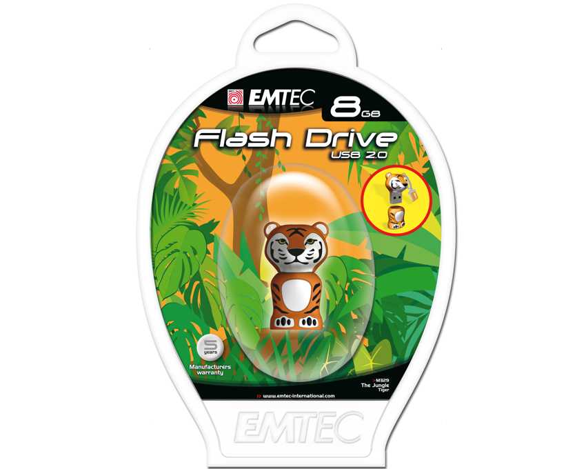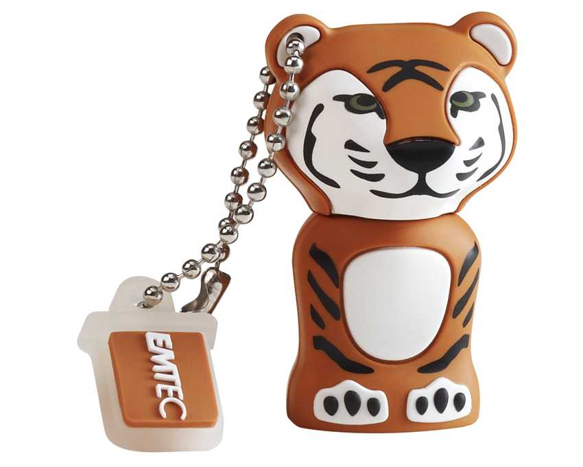 Diseño exclusivo EMTEC Fabricados en goma con tacto de "piel de melocotón" Tamaño mini: ningún animal supera los 50mm Cada memoria cuenta con un extremo de goma suspendido a una cadenita: Lleve a todas partes su animal favorito. Gracias a su cadenita, usted podrá colgar su memoria USB a su llavero o incluso su bolso de mano. No hay riesto de perder una parte de la memoria cuando esta se encuentra conectada: basta con unir las dos partes con el extremo de goma. Capacidad 8GB Read speed Hasta18MB/s Write speed Hasta 8MB/s Operating system Windows 7 – Vista – XP – 2000 - 98Se*, Mac 8.6 - OS 9 - OS X, Linux Compatibility Compatibilidad universal USB 2.0 Garantía 5 años Dimensiones del producto Tiger: 42x26x25mm / Snake: 11x40x54mm Blister dimensions 172 x 122 x 33mm Contenido del paquete Cadena incluída