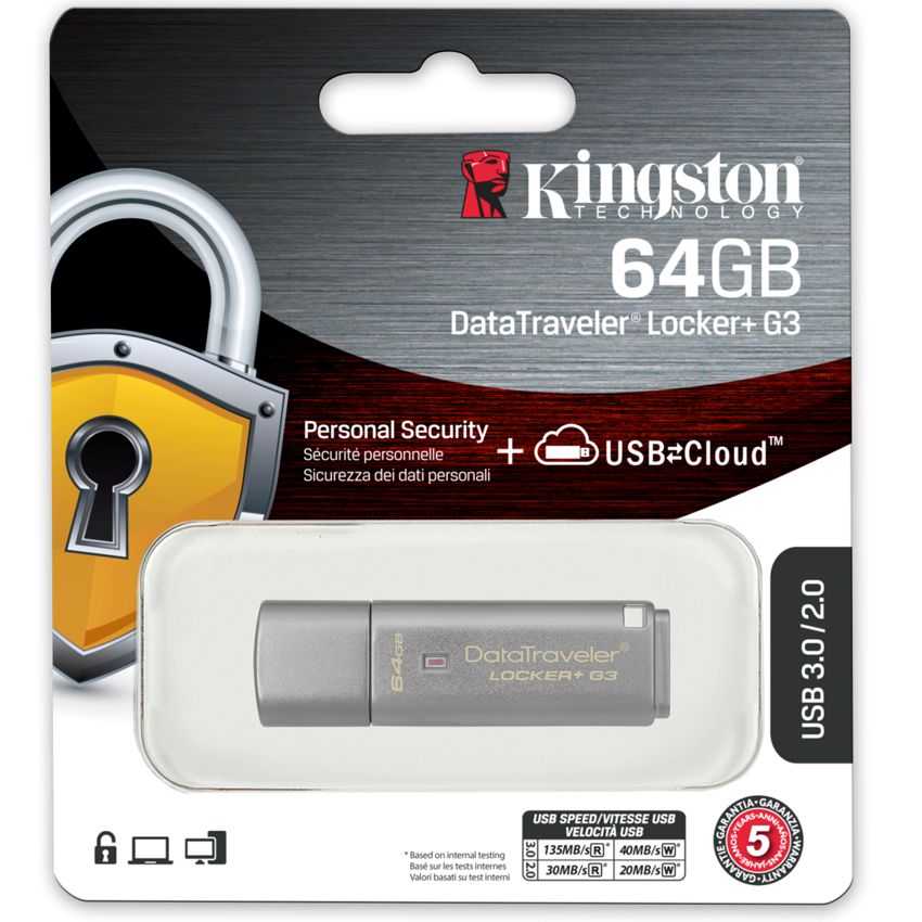 Descripción Ponga un candado en sus datos personales con la unidad DataTraveler® Locker+ G3 de Kingston. Es una manera segura y fácil de mantener sus facturas, extractos bancarios u otros documentos confidenciales seguros, gracias a un sistema de cifrado del hardware y protección mediante contraseña que proporciona una doble capa de seguridad de los datos. La unidad se bloquea y reformatea después de 10 intentos fallidos de inicio de sesión, por lo que los usuarios pueden quedarse tranquilos sabiendo que sus datos permanecen seguros incluso si extravían la unidad o son víctima de un hurto. DataTraveler Locker+ G3 ofrece como función optativa la copia de seguridad en la nube.