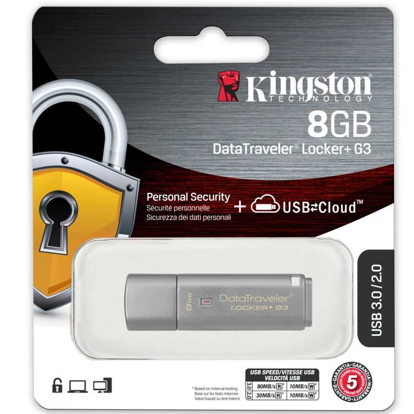 Descripción Eche el candado a sus datos personales con la unidad Flash USB DataTraveler® Locker+ G3 de Kingston. Esta unidad protege sus documentos confidenciales a través de cifrado de hardware y protección mediante contraseña al mismo tiempo que ofrece las impresionantes velocidades de la tecnología USB 3.0. DataTraveler Locker+ G3 es una unidad fácil de configurar y utilizar sin necesidad de instalar ninguna aplicación. Es personalizable y funciona tanto en PC como en Mac y tiene una resistente carcasa metálica y un enganche integrado. Está respaldada por cinco años de garantía, soporte técnico gratuito y la legendaria fiabilidad de Kingston®.