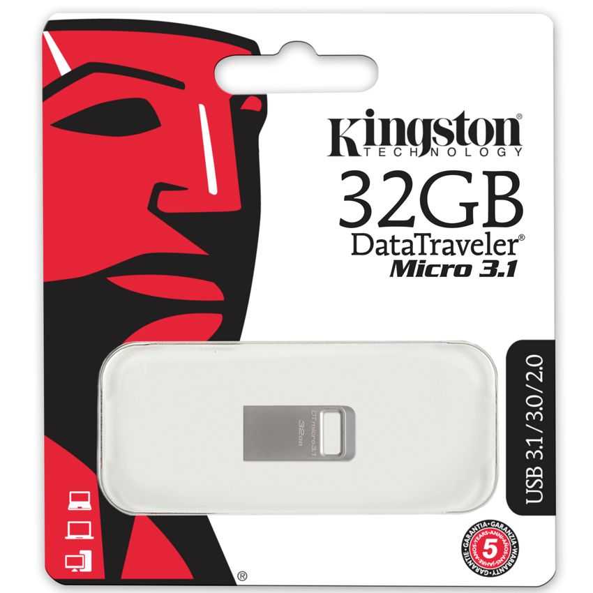 DescripciónPequeña y sin tapa, para llevar a dondequiera que vaya. DataTraveler® Micro 3.1 es una unidad Flash ultra pequeña y ligera, sin tapa, que proporciona velocidades USB 3.1 de hasta 100MB/s en lectura y 14MB/s en escritura. Es lo suficientemente pequeña para que pueda mantenerse conectada a su portátil mientras está en su bolsa, y tiene un agujero incorporado para el llavero. Guarde hasta 64GB de su música, películas y archivos favoritos y mucho más con esta unidad ""conectar y listo"", idónea para tabletas, ordenadores portátiles, sistemas de sonido de coche y televisores. - Diseño pequeño y sin tapa con agujero incorporado para llavero - Altas velocidades de USB 3.1 - Hasta 64GB de almacenamiento ampliado.EspecificacionesCapacidad: 32 GBVelocidad de lectura: 100 MB/sVelocidad de escritura: 15 MB/sSistema operativo Windows soportado: Windows 7 Enterprise, Windows 7 Enterprise x64, Windows 7 Home Basic, Windows 7 Home Basic x64, Windows 7 Home Premium, Windows 7 Home Premium x64, Windows 7 Professional, Windows 7 Professional x64, Windows 7 Starter, Windows 7 Starter x64, Windows 7 Ultimate, Windows 7 Ultimate x64, Windows 8, Windows 8 Enterprise, Windows 8 Enterprise x64, Windows 8 Pro, Windows 8 Pro x64, Windows 8 x64, Windows 8.1, Windows 8.1 Enterprise, Windows 8.1 Enterprise x64, Windows 8.1 Pro, Windows 8.1 Pro x64, Windows 8.1 x64, Windows Vista Business, Windows Vista Business x64, Windows Vista Enterprise, Windows Vista Enterprise x64, Windows Vista Home Basic, Windows Vista Home Basic x64, Windows Vista Home Premium, Windows Vista Home Premium x64, Windows Vista Ultimate, Windows Vista Ultimate x64Sistema operativo MAC soportado: Mac OS X 10.10 Yosemite, Mac OS X 10.7 Lion, Mac OS X 10.8 Mountain Lion, Mac OS X 10.9 MavericksSistema operativo Linux soportado: SiFactor de forma: Sin tapaColor del producto: MetálicoMateriales: MetalIntervalo de temperatura operativa: 0 - 60 °CIntervalo de temperatura de almacenaje: -20 - 85 °CAncho: 2,495 cmProfundidad: 1,22 cmAltura: 4,5 mmCantidad: 1Tipo de embalaje: AmpollaVoltaje de memoria: 5VGarantía: 5 Yrs