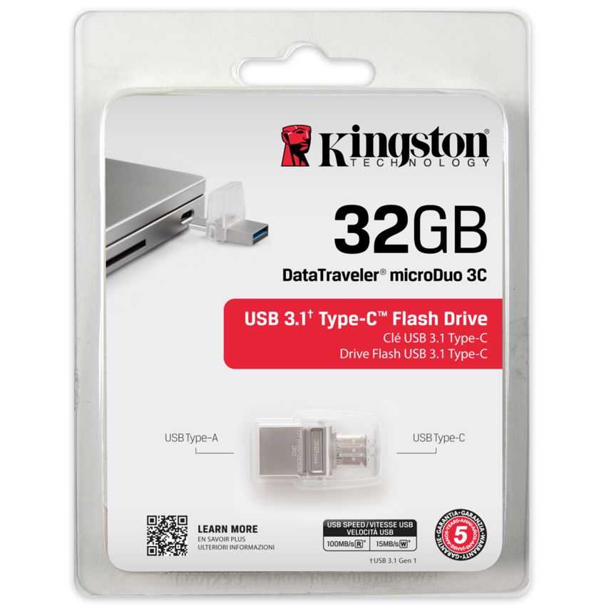 Descripción Doble interfaz, para puertos USB Type-A y Type-C. Las unidades DataTraveler® microDuo 3C de Kingston cuentan con una interfaz doble que permite su uso en puertos estándar USB y también en puertos USB Type-C?, los que las hace ideales para dispositivos tales como los smartphones, tablets y computadoras PC y Mac de los modelos más recientes. Están disponibles en capacidades de hasta 64 GB y ofrecen rápidas velocidades de transferencia de hasta 100 MB/s en lectura y 15 MB/s en escritura. - Interfaz doble, que se adapta a puertos USB Type-A y Type-C? - Almacenamiento adicional para los dispositivos más recientes, con limitaciones en sus puertos de expansión - Rápidas velocidades de transferencia de hasta 100 MB/s en lectura y 15 MB/s en escritura.