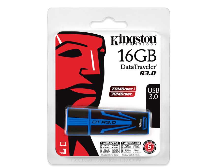 La unidad flash USB DataTraveler R3.0 de Kingston ofrece un rendimiento USB 3.0 de alta velocidad para ahorrar tiempo y aliviar los cuellos de botella al transferir los archivos además de una excelente protección proporcionada por su carcasa de goma resistente a los impactos.