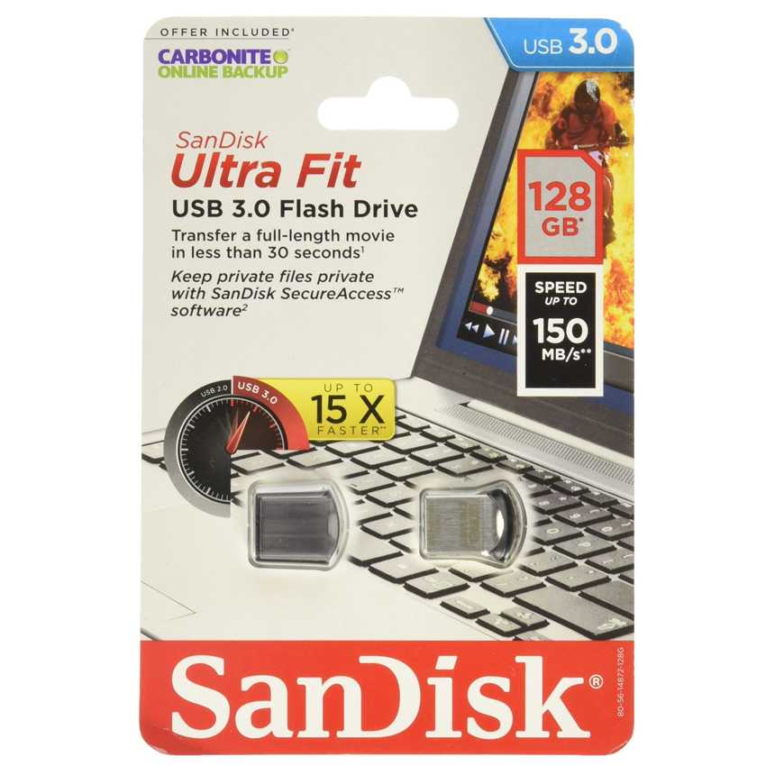 DescripciónSandisk Ultra Fit USB 3.0 128GB. Capacidad: 128 GB, Versión USB: USB 3.0 (3.1 Gen 1), USB connector: Type-A. Factor de forma: Tapa, Color del producto: Negro. Ancho: 1,59 cm, Profundidad: 1,91 cm, Altura: 8,8 mmEspecificacionesCapacidad: 128 GBVersión USB: USB 3.0 (3.1 Gen 1)USB connector: Type-AConector de iluminación: NoConector micro USB: NoLector de huella digital: NoProtección mediante contraseña: SiAcceso con PIN-seguro: NoVelocidad de lectura: 150 MB/sFactor de forma: TapaColor del producto: NegroIntervalo de temperatura operativa: 0 - 45 °CIntervalo de temperatura de almacenaje: -10 - 70 °CAncho: 1,59 cmProfundidad: 1,91 cmAltura: 8,8 mmCantidad: 1