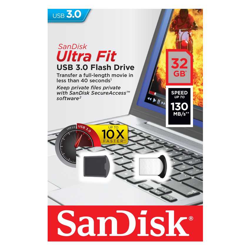 Descripción Sandisk Ultra Fit USB 3.0 32GB. Capacidad: 32 GB, Versión USB: USB 3.0 (3.1 Gen 1), USB connector: Type-A. Factor de forma: Tapa, Color del producto: Negro. Ancho: 1,59 cm, Profundidad: 1,91 cm, Altura: 8,8 mm