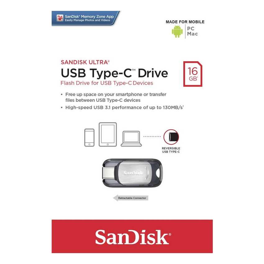Descripción Sandisk Sandisk Ultra USB Type-C Flash Drive 16 GB. Capacidad: 16 GB, Tipo de interfaz: USB 3.1/USB 3.0, Velocidad de lectura: 130 MB/s. Factor de forma: Slide, Color del producto: Negro, Plata. Ancho: 1,93 cm, Profundidad: 6,6 mm, Altura: 4,06 cm