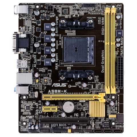 Descripción ASUS A58M-K. Supported memory types: DDR3-SDRAM, Memory slots type: DIMM, Supported memory clock speeds: 1333, 1600, 1866, 2133, 2400. Processor family: AMD, Compatible processor series: AMD A, Athlon, Processor socket: Socket FM2+. Supported hard disk drive interfaces: Serial ATA II. LAN controller: Realtek 8111GR, Ethernet interface type: Gigabit. Component for: PC, Motherboard chipset family: AMD, Motherboard chipset: AMD A58 FCH (Bolton D2)