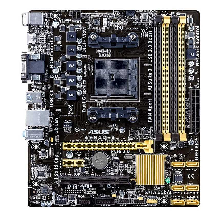Descripción ASUS A88XM-A. tipos de memoria compatibles: DDR3-SDRAM, Tipo de ranuras de memoria: DIMM, Canales de memoria: Dual. Familia de procesador: AMD, Procesador compatible: AMD A, Athlon, Socket de procesador: Socket FM2+. Interfaces de unidad de disco duro soportadas: Serial ATA III. Controlador LAN: Realtek RTL8111G, Tipo de interfaz ethernet: Gigabit. Componente para: PC, Familia de componentes de tarjeta madre: AMD, Circuito integrado de tarjeta madre: AMD A88X