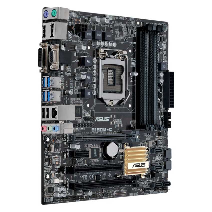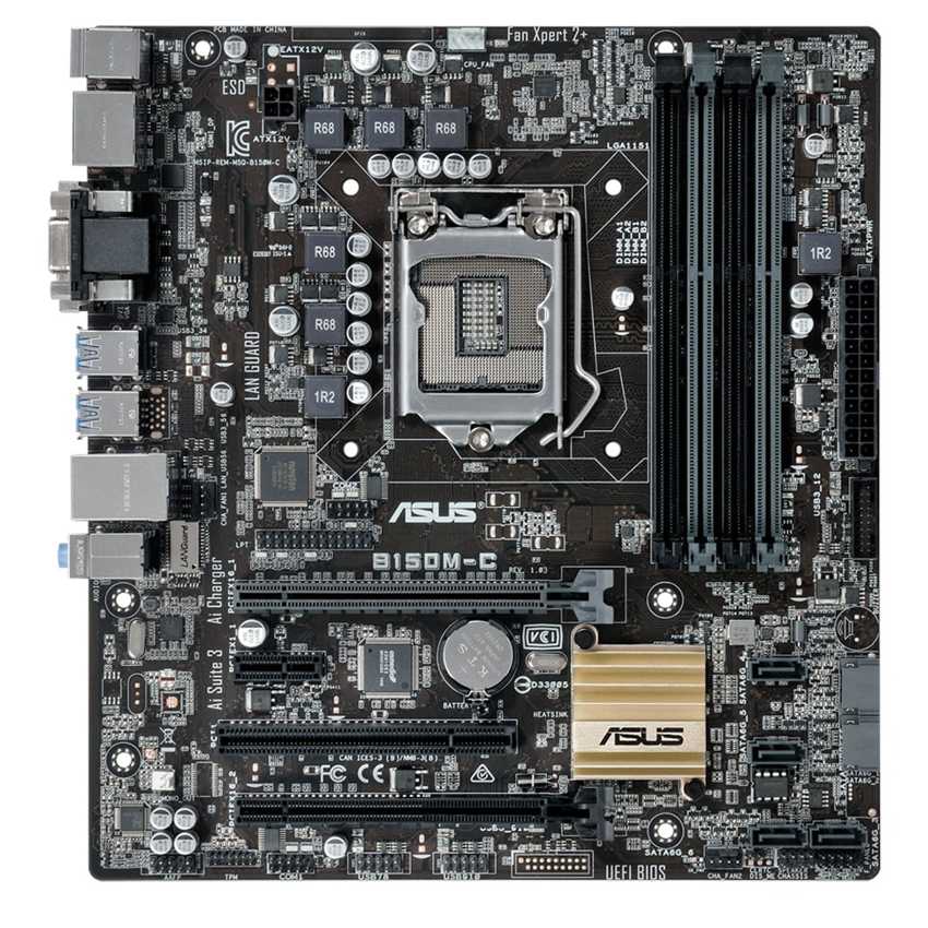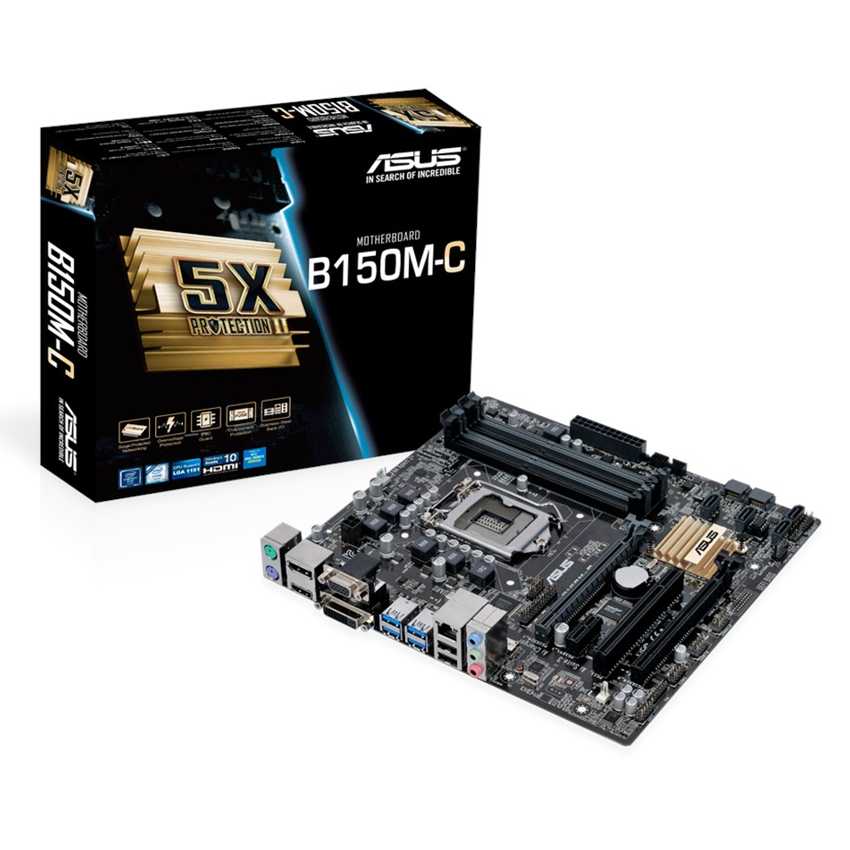 Descripción ASUS B150M-C. tipos de memoria compatibles: DDR4-SDRAM, Tipo de ranuras de memoria: DIMM, Velocidades de reloj de memoria soportadas: 2133 MHz. Familia de procesador: Intel, Procesador compatible: Celeron, Core i3, Core i5, Core i7, Pentium, Socket de procesador: LGA1151. Interfaces de unidad de disco duro soportadas: SATA. Controlador LAN: Realtek 8111F, Tipo de interfaz ethernet: Gigabit. Componente para: PC, Familia de componentes de tarjeta madre: Intel, Circuito integrado de tarjeta madre: Intel B150