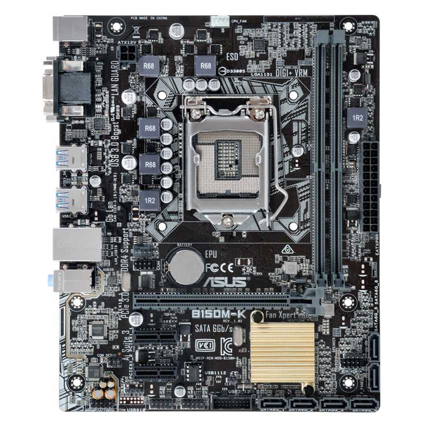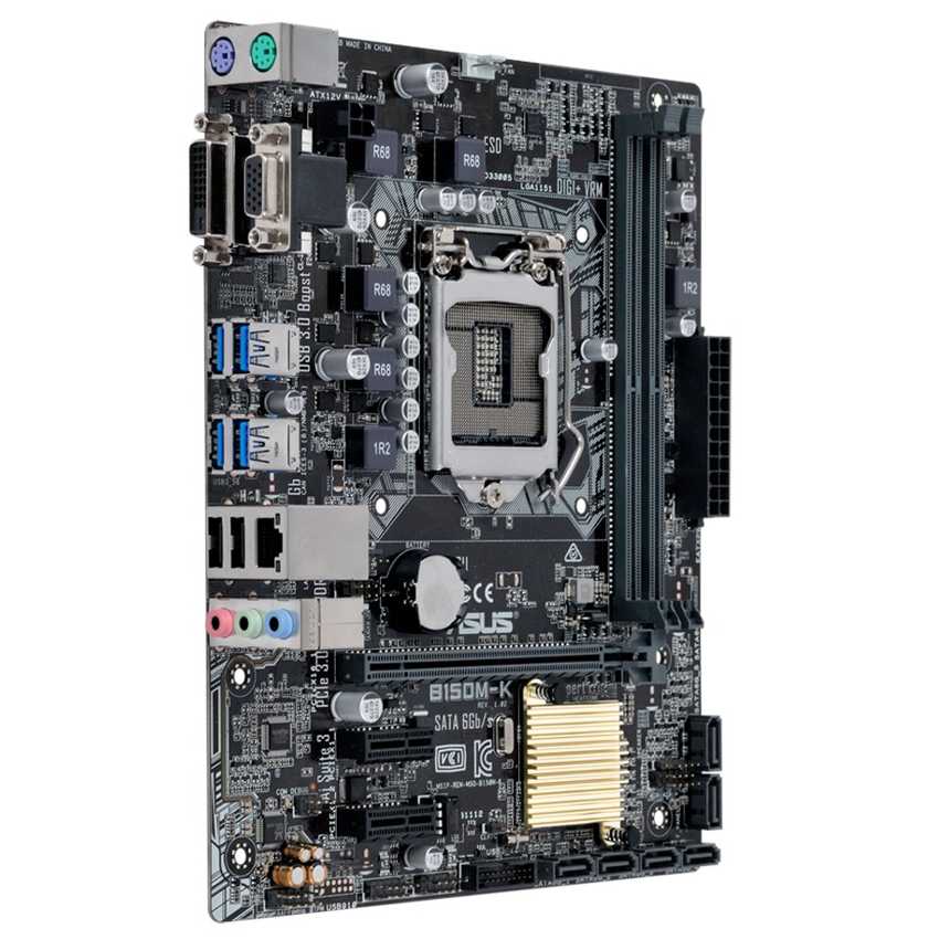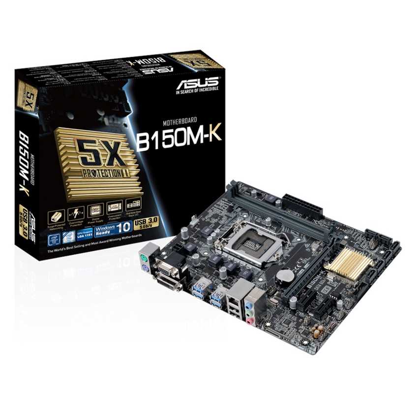Descripción ASUS B150M-K. tipos de memoria compatibles: DDR4-SDRAM, Tipo de ranuras de memoria: DIMM, Canales de memoria: Dual. Familia de procesador: Intel, Procesador compatible: Core i5, Core i7, Celeron, Pentium, Core i3, Socket de procesador: LGA1151. Interfaces de unidad de disco duro soportadas: Serial ATA III. Controlador LAN: Realtek RTL8111H, Tipo de interfaz ethernet: Gigabit. Componente para: PC, Familia de componentes de tarjeta madre: Intel, Circuito integrado de tarjeta madre: Intel B150