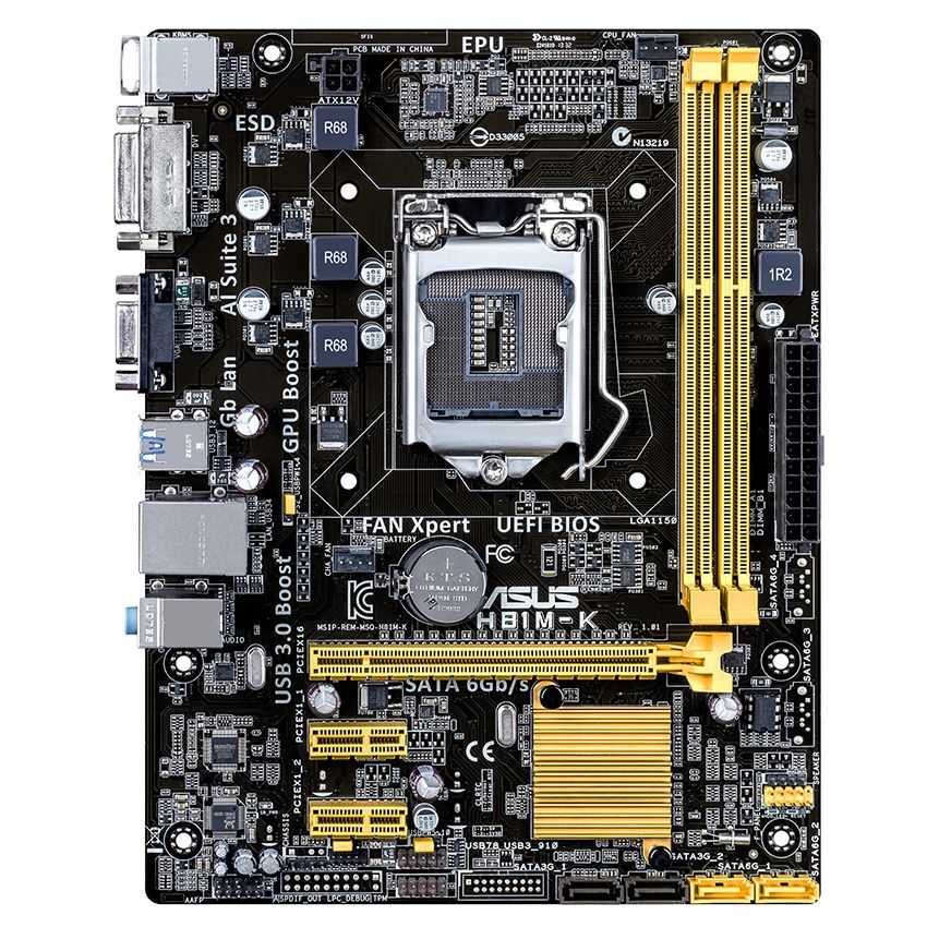 Descripción ASUS H81M-K. tipos de memoria compatibles: DDR3-SDRAM, Tipo de ranuras de memoria: DIMM, Soporte de canales de memoria: Dual. Familia de procesador: Intel, Procesador compatible: Celeron, Core i3, Core i5, Core i7, Pentium, Socket de procesador: Socket H3(1150). Interfaces de unidad de disco duro soportadas: SATA. Controlador LAN: Realtek 8111G, Tipo de interfaz ethernet: Gigabit. Componente para: PC, Familia de componentes de tarjeta madre: Intel, Circuito integrado de tarjeta madre: Intel H81