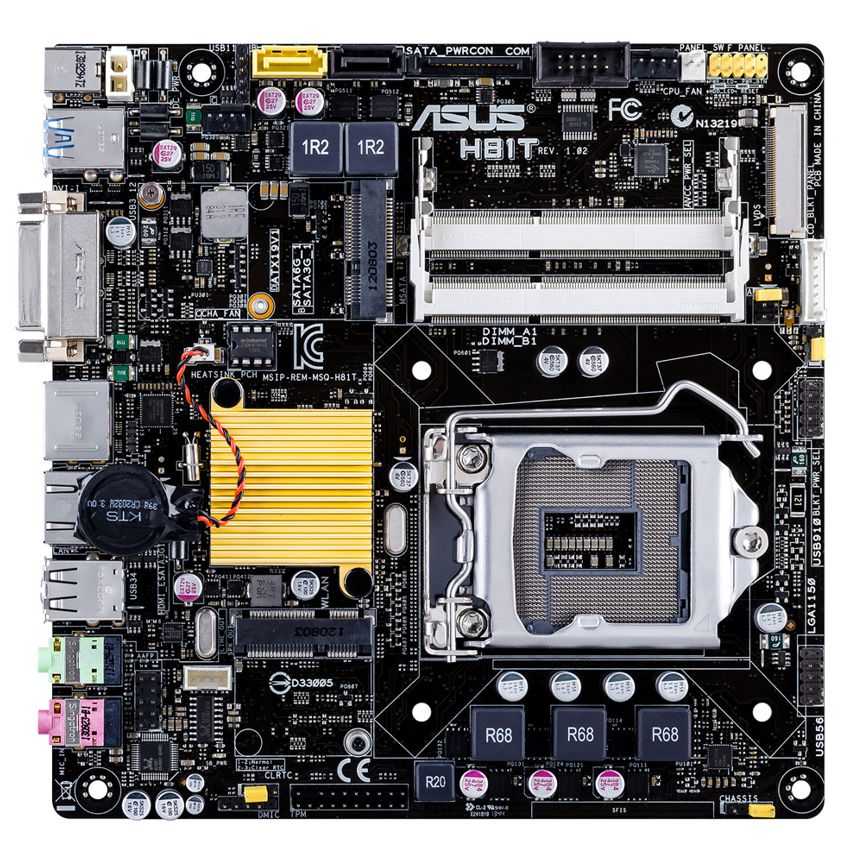 Descripción ASUS H81T. tipos de memoria compatibles: DDR3-SDRAM, Tipo de ranuras de memoria: SO-DIMM, Canales de memoria: Dual. Familia de procesador: Intel, Procesador compatible: Celeron, Core i3, Core i5, Core i7, Pentium, Socket de procesador: Socket H3 (LGA 1150). Interfaces de unidad de disco duro soportadas: Serial ATA II, Serial ATA III. Controlador LAN: Realtek 8111G, Tipo de interfaz ethernet: Gigabit. Componente para: PC, Familia de componentes de tarjeta madre: Intel, Circuito integrado de tarjeta madre: Intel H81