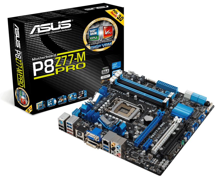 P8Z77-M PRO, LGA 1155, Intel Z77, 4 x DDR3 2600+MHz, Intel HD Graphics, 3 x PCI Express (2-Way/Quad-GPU SLI, 2-Way/3-Way/Quad-GPU CrossFireX, LucidLogix Virtu MVP), 4 x SATA 3.0Gb/s, 2 x SATA 6.0Gb/s, UEFI BIOS, mATXPlaca base Micro ATX Z77 con un diseño de alimentación digital muy preciso, control independiente de los ventiladores y un rendimiento gráfico híbrido un 60% superior. - Dual Intelligent Processors 2 con DIGI+ VRM. - USB 3.0 Boost ? Transmisiones USB 3.0 más rápidas con UASP. - USB BIOS Flashback? BIOS Flashback más simple.