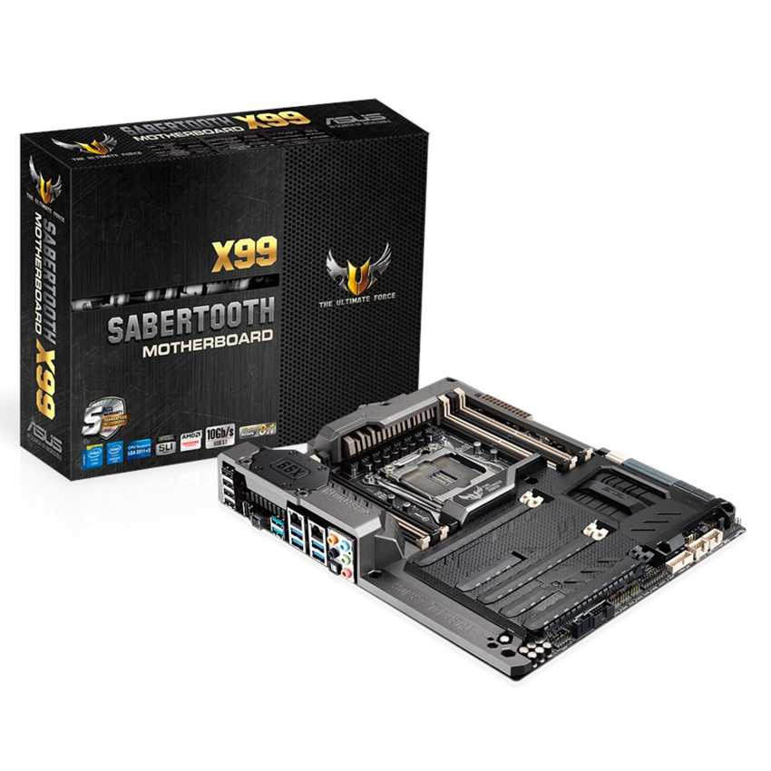 Descripción ASUS SABERTOOTH X99. tipos de memoria compatibles: DDR4-SDRAM, Tipo de ranuras de memoria: DIMM, Velocidades de reloj de memoria soportadas: 2133,2400 MHz. Familia de procesador: Intel, Procesador compatible: Core i7, Socket de procesador: LGA 2011-v3. Interfaces de unidad de disco duro soportadas: M.2, Serial ATA III. Controlador LAN: Intel I218V, Realtek 8111GR, Tipo de interfaz ethernet: Gigabit. Componente para: PC, Familia de componentes de tarjeta madre: Intel, Circuito integrado de tarjeta madre: Intel X99