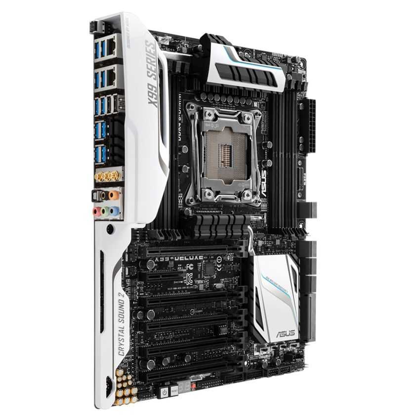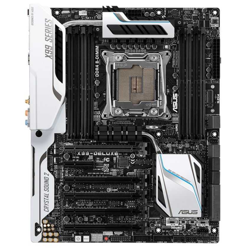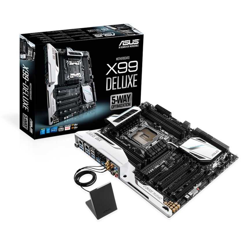 Descripción ASUS X99-DELUXE. tipos de memoria compatibles: DDR4-SDRAM, Tipo de ranuras de memoria: DIMM, Canales de memoria: Quad. Familia de procesador: Intel, Procesador compatible: Core i7, Socket de procesador: LGA 2011-v3. Interfaces de unidad de disco duro soportadas: SATA. Wi-Fi estándares: 802.11a, 802.11ac, 802.11b, 802.11g, 802.11n, Versión de Bluetooth: 4.0. Componente para: PC, Familia de componentes de tarjeta madre: Intel, Circuito integrado de tarjeta madre: Intel X99