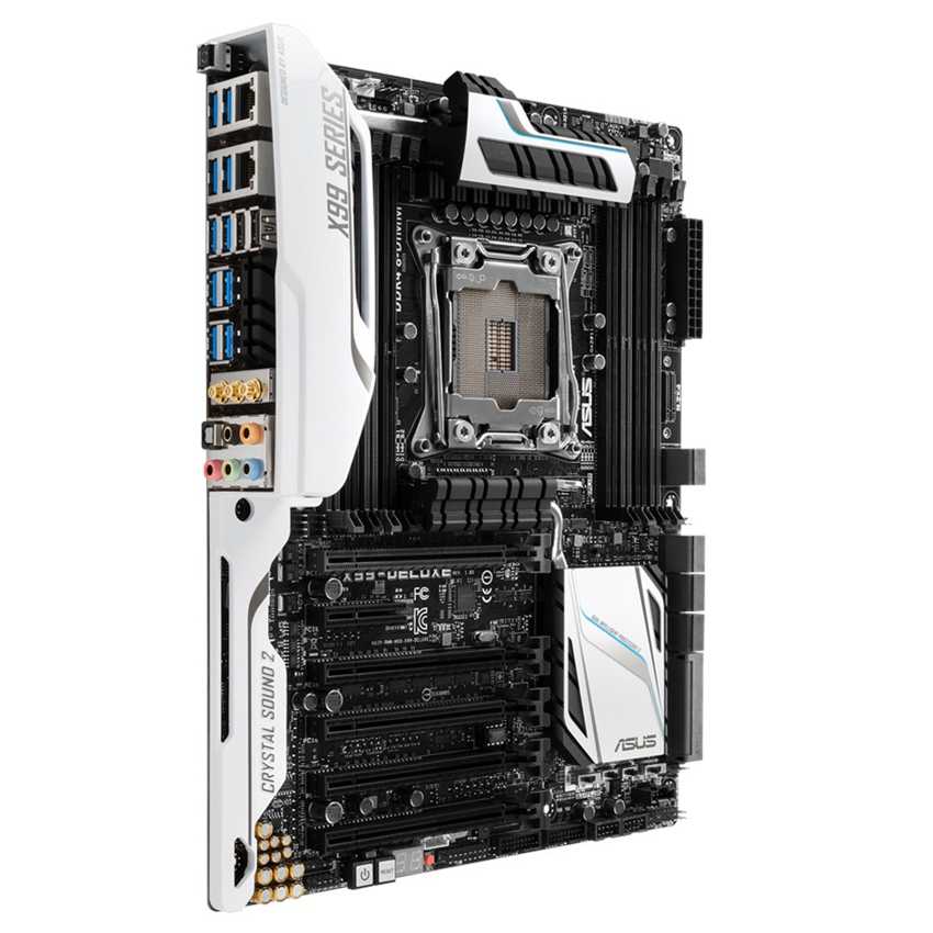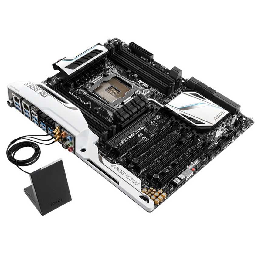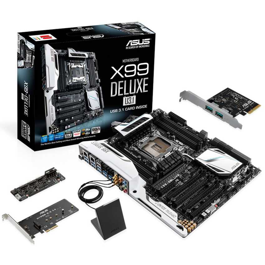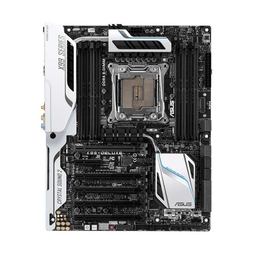Descripción ASUS X99-DELUXE/U3.1. tipos de memoria compatibles: DDR4-SDRAM, Tipo de ranuras de memoria: DIMM, Canales de memoria: Cuadrángulo. Familia de procesador: Intel, Procesador compatible: Core i7, Socket de procesador: Socket R (LGA 2011). Interfaces de unidad de disco duro soportadas: Serial ATA III. Controlador LAN: Intel I218V, Tipo de interfaz ethernet: Gigabit, Wi-Fi estándares: 802.11a, 802.11ac, 802.11b, 802.11g, 802.11n. Familia de componentes de tarjeta madre: Intel, Circuito integrado de tarjeta madre: Intel X99, Tarjeta madre, factor de forma: ATX