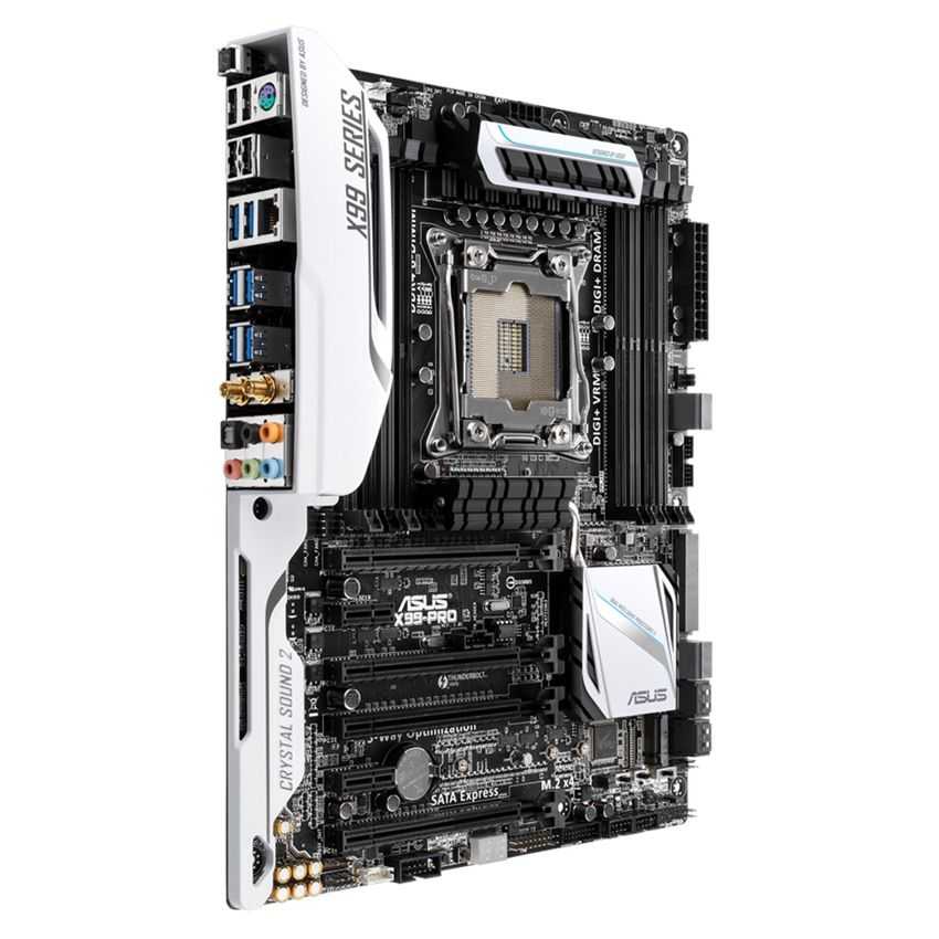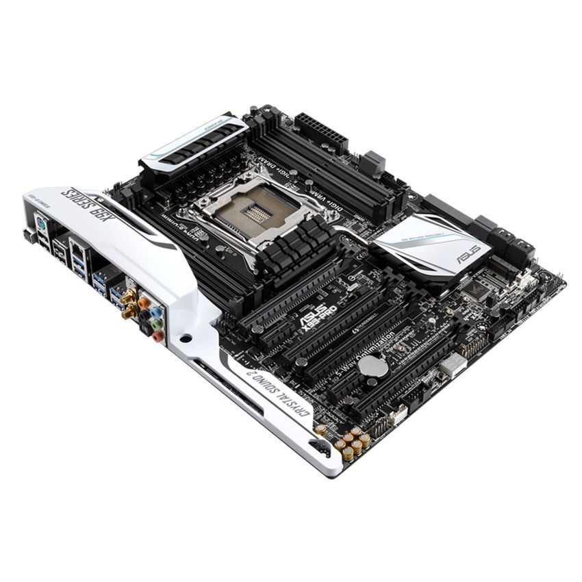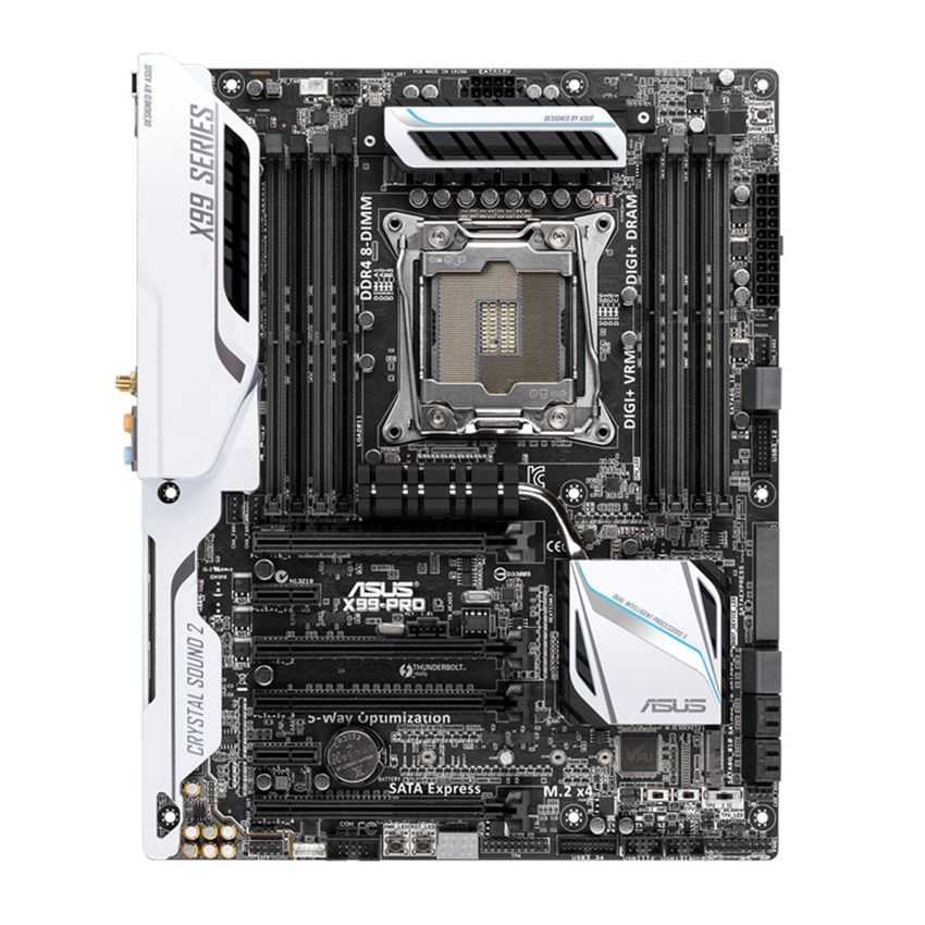 Descripción ASUS X99-PRO. tipos de memoria compatibles: DDR4-SDRAM, Tipo de ranuras de memoria: DIMM, Soporte de canales de memoria: Quad. Familia de procesador: Intel, Procesador compatible: Core i7, Socket de procesador: LGA 2011-v3. Interfaces de unidad de disco duro soportadas: Serial ATA III. Controlador LAN: Intel I218V, Tipo de interfaz ethernet: Gigabit, Wi-Fi estándars: 802.11a, 802.11ac, 802.11b, 802.11g, 802.11n. Componente para: PC, Familia de componentes de tarjeta madre: Intel, Circuito integrado de tarjeta madre: Intel X99