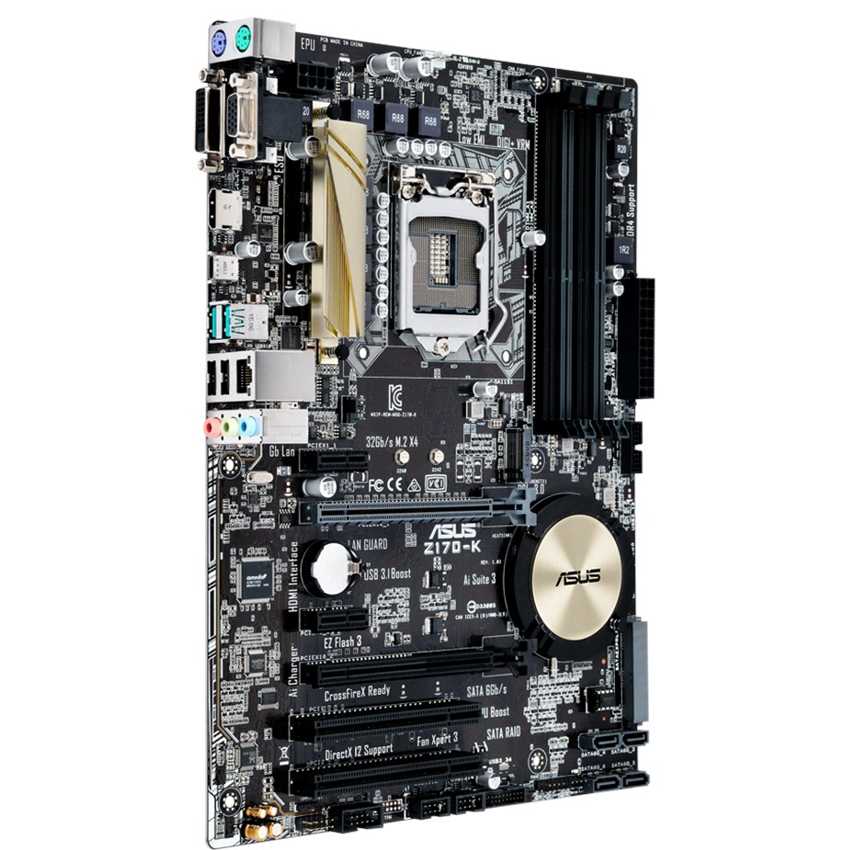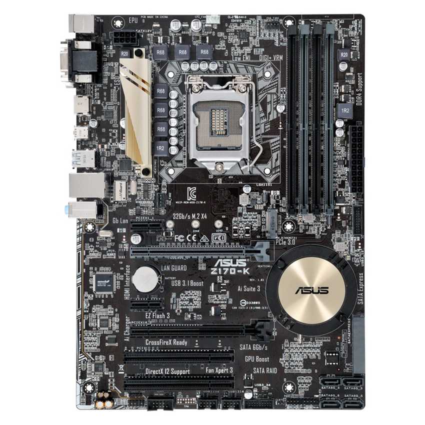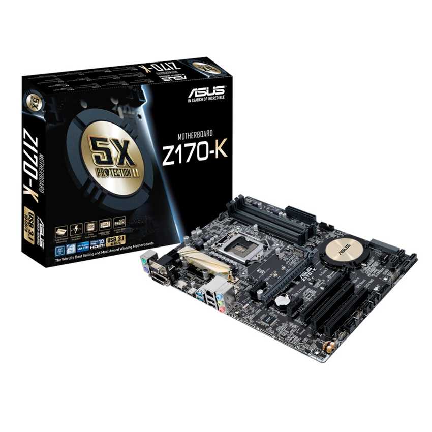 Descripción ASUS Z170-K. tipos de memoria compatibles: DDR4-SDRAM, Tipo de ranuras de memoria: DIMM, Canales de memoria: Dual. Familia de procesador: Intel, Procesador compatible: Celeron, Core i3, Core i5, Core i7, Pentium, Socket de procesador: LGA1151. Interfaces de unidad de disco duro soportadas: SATA, Serial ATA III. Controlador LAN: Realtek 8111GR, Tipo de interfaz ethernet: Gigabit. Componente para: PC, Familia de componentes de tarjeta madre: Intel, Circuito integrado de tarjeta madre: Intel Z170