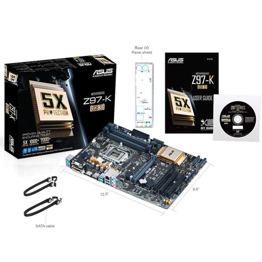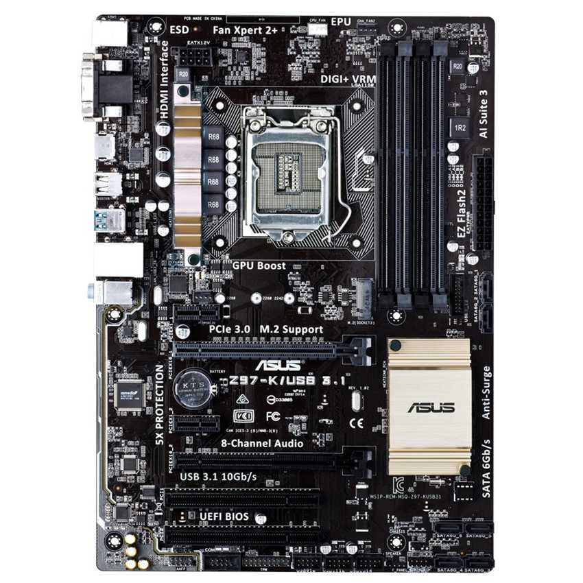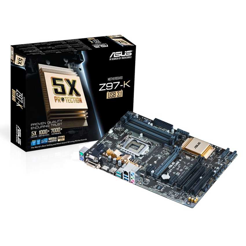Descripción ASUS Z97-K/USB 3.1. tipos de memoria compatibles: DDR3-SDRAM, Tipo de ranuras de memoria: DIMM, Canales de memoria: Dual. Familia de procesador: Intel, Procesador compatible: Celeron, Core i3, Core i5, Core i7, Pentium, Socket de procesador: Socket H3 (LGA 1150). Interfaces de unidad de disco duro soportadas: Serial ATA III. Controlador LAN: Realtek 8111GR, Tipo de interfaz ethernet: Gigabit. Componente para: PC, Familia de componentes de tarjeta madre: Intel, Circuito integrado de tarjeta madre: Intel Z97