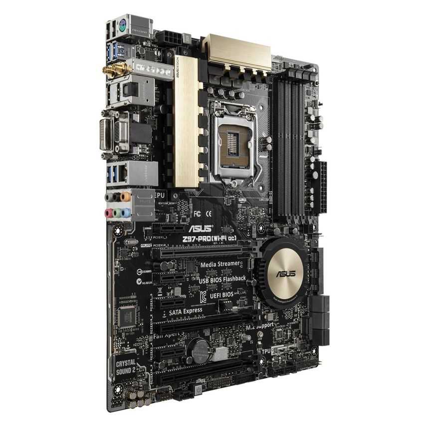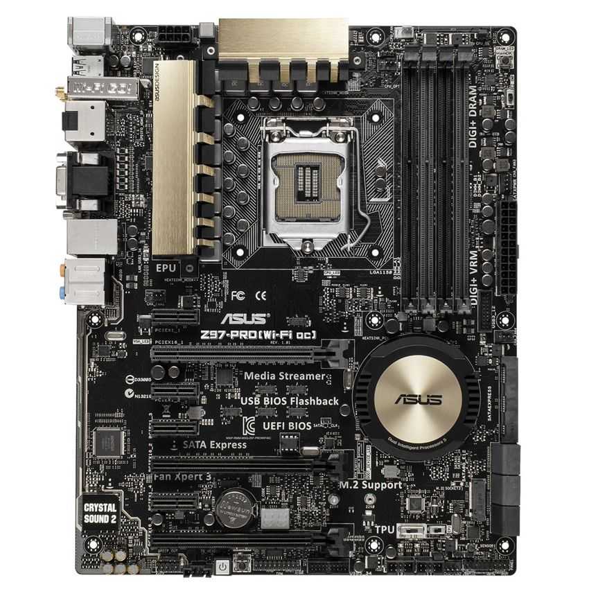 Descripción ASUS Z97-PRO(Wi-Fi ac). tipos de memoria compatibles: DDR3-SDRAM, Tipo de ranuras de memoria: DIMM, Soporte de canales de memoria: Dual. Familia de procesador: Intel, Procesador compatible: Celeron, Core i3, Core i5, Core i7, Pentium, Socket de procesador: Socket H3 (LGA 1150). Interfaces de unidad de disco duro soportadas: Serial ATA III. Controlador LAN: Intel I218V, Tipo de interfaz ethernet: Gigabit, Wi-Fi estándars: 802.11a, 802.11ac, 802.11b, 802.11g, 802.11n. Componente para: PC, Familia de componentes de tarjeta madre: Intel, Circuito integrado de tarjeta madre: Intel Z97
