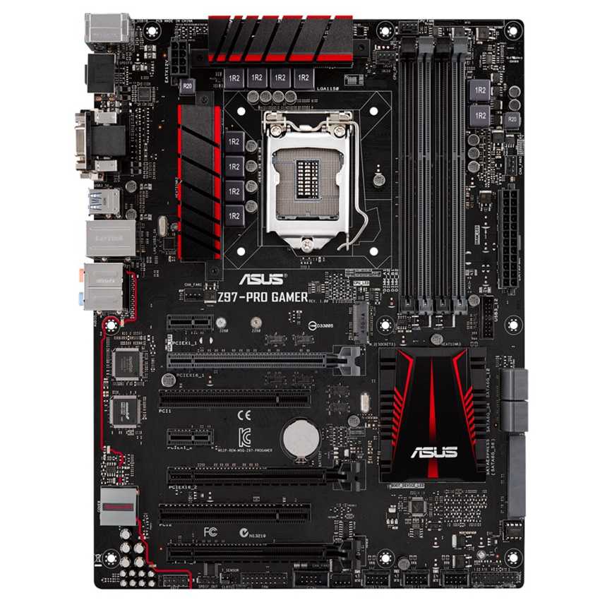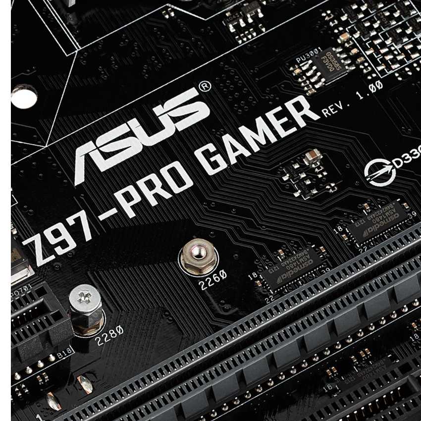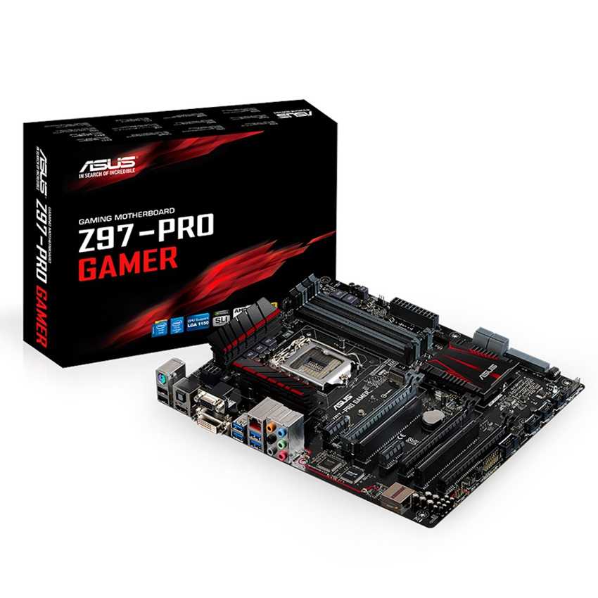 Descripción ASUS Z97-PRO GAMER. tipos de memoria compatibles: DDR3-SDRAM, Tipo de ranuras de memoria: DIMM, Velocidades de reloj de memoria soportadas: 1333, 1600 MHz. Familia de procesador: Intel, Procesador compatible: Celeron, Core i3, Core i5, Pentium, Socket de procesador: Socket H3 (LGA 1150). Interfaces de unidad de disco duro soportadas: SATA. Controlador LAN: Intel I218V, Tipo de interfaz ethernet: Gigabit. Componente para: PC, Familia de componentes de tarjeta madre: Intel, Circuito integrado de tarjeta madre: Intel Z97