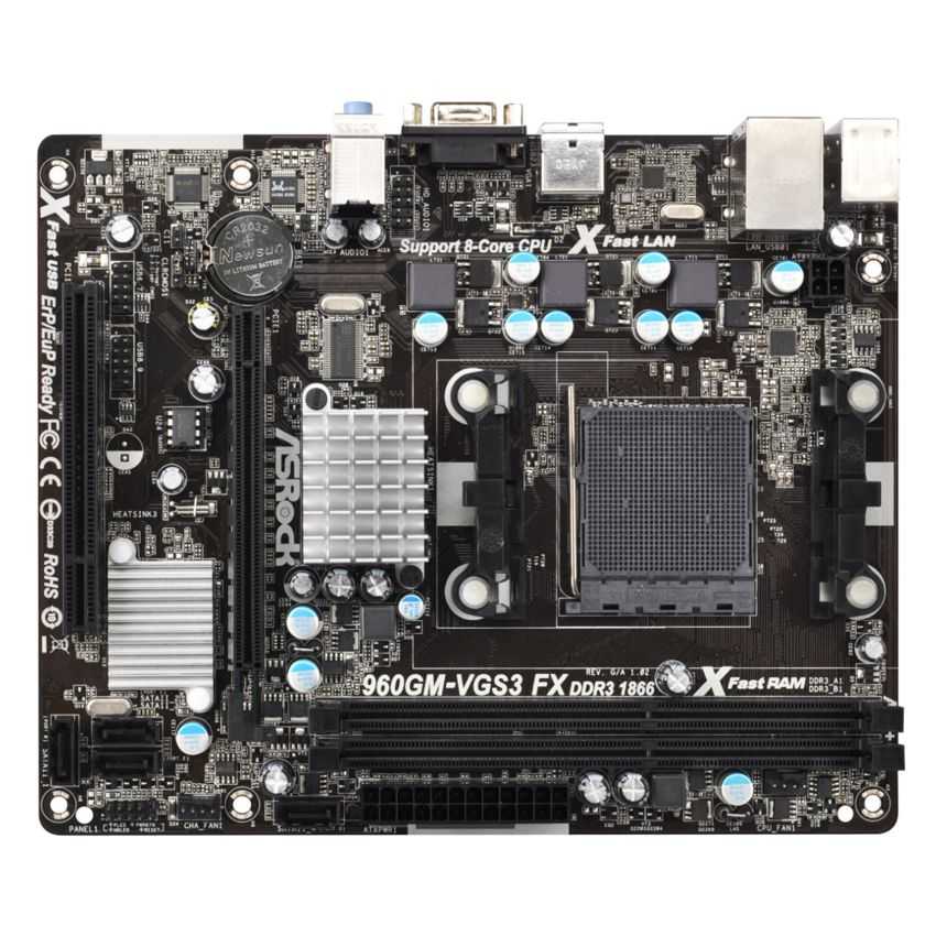 Descripción Asrock 960GM-VGS3 FX. tipos de memoria compatibles: DDR3-SDRAM, Tipo de ranuras de memoria: DIMM, Canales de memoria: Dual. Familia de procesador: AMD, Socket de procesador: Socket AM3+, Procesador FSB, soporte: 2600 MHz. Interfaces de unidad de disco duro soportadas: Serial ATA II. Controlador LAN: Atheros AR8151, Tipo de interfaz ethernet: Gigabit. Componente para: PC, Familia de componentes de tarjeta madre: AMD, Circuito integrado de tarjeta madre: AMD 760G