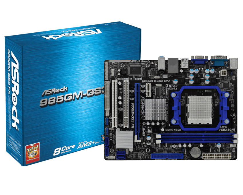Descripción Asrock 985GM-GS3 FX. tipos de memoria compatibles: DDR3-SDRAM, Tipo de ranuras de memoria: DIMM, Canales de memoria: Dual. Familia de procesador: AMD, Socket de procesador: Socket AM3+, Procesador FSB, soporte: 2600 MHz. Interfaces de unidad de disco duro soportadas: ATA Paralelo, Serial ATA II. Controlador LAN: Realtek RTL8111E, Tipo de interfaz ethernet: Gigabit. Componente para: PC, Familia de componentes de tarjeta madre: AMD, Circuito integrado de tarjeta madre: AMD 785G