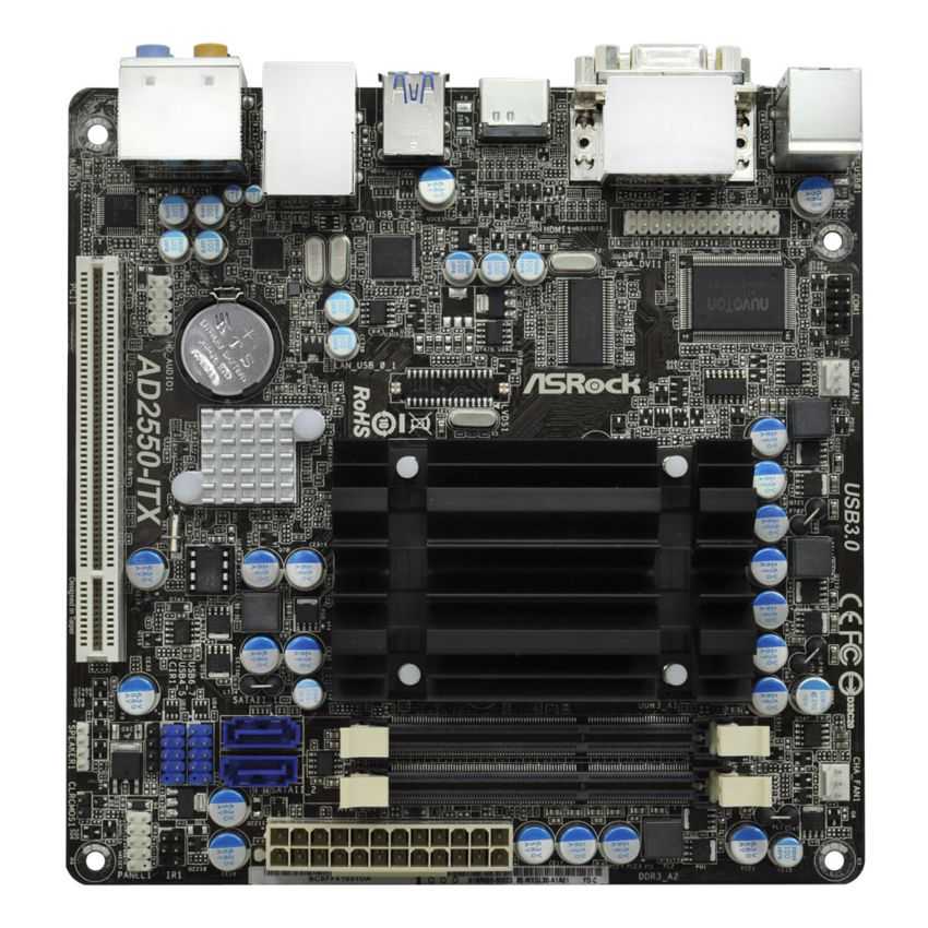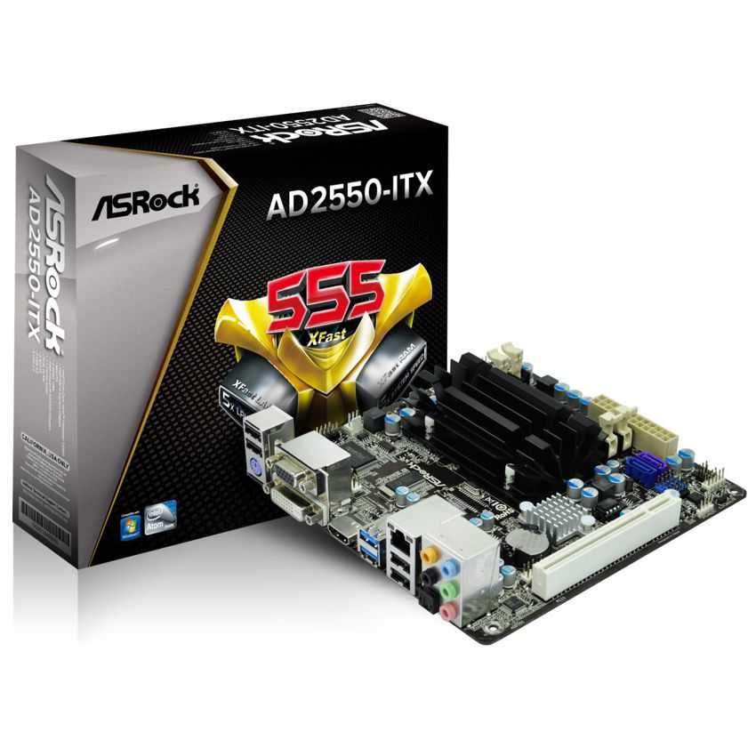 Descripción Asrock AD2550-ITX. tipos de memoria compatibles: DDR3-SDRAM, Tipo de ranuras de memoria: SO-DIMM, Velocidades de reloj de memoria soportadas: 800, 1066 MHz. Familia de procesador: Intel, Procesador compatible: Atom, Socket de procesador: NA (CPU integrada). Interfaces de unidad de disco duro soportadas: SATA. Controlador LAN: Realtek RTL8111E, Tipo de interfaz ethernet: Gigabit. Componente para: PC, Familia de componentes de tarjeta madre: Intel, Circuito integrado de tarjeta madre: Intel NM10 Express