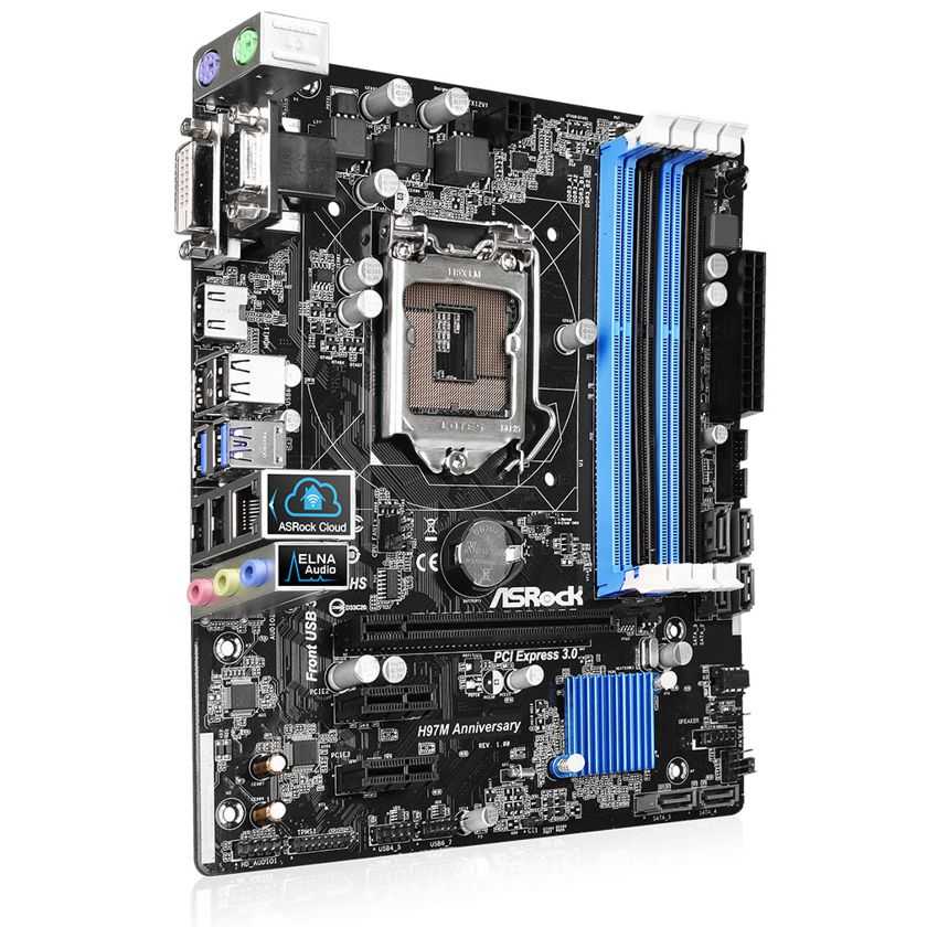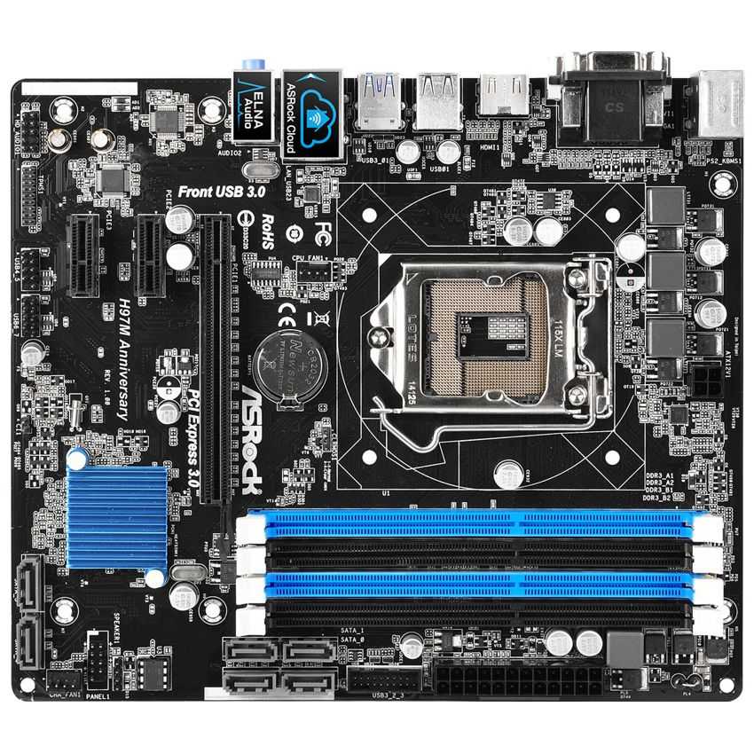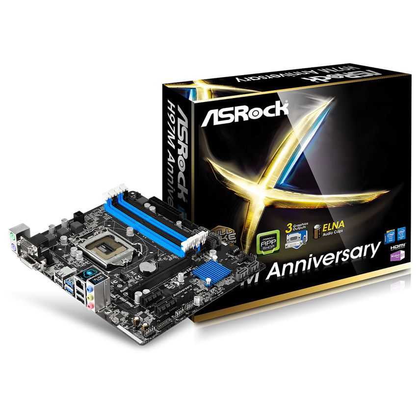 Descripción Asrock H97M Anniversary. tipos de memoria compatibles: DDR3-SDRAM, Tipo de ranuras de memoria: DIMM, Canales de memoria: Dual. Familia de procesador: Intel, Procesador compatible: Celeron, Core i3, Core i5, Core i7, Pentium, Socket de procesador: Socket H3 (LGA 1150). Interfaces de unidad de disco duro soportadas: Serial ATA III. Controlador LAN: Realtek RTL8111GR, Tipo de interfaz ethernet: Gigabit. Componente para: PC, Familia de componentes de tarjeta madre: Intel, Circuito integrado de tarjeta madre: Intel H97