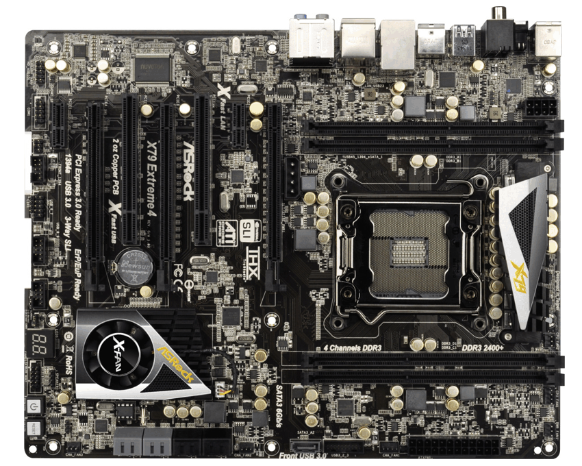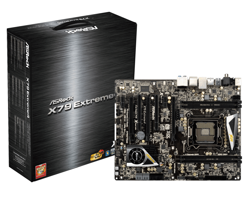 X79 Extreme4, LGA2011, Intel X79, 4 x DDR3 2400+MHz, 3 x PCIe3.0 x16 (3-Way/2-Way AMD CrossFireX/NVIDIA SLI), 4 x SATA 3.0Gb/s, 5 x SATA 6.0Gb/s, IR, UEFI, ATX - Capacitadores Premium Gold (2.5 aumento de vida), Capacitadores 100% fabricados en Japón con condensadores de Polímero conductivo. - Familia de procesadores Intel® Core? i7 para el socket LGA 2011. - Compatible con Quad Channel DDR3 2400+(OC). - Digi Power, Avanzado diseño de fase de alimentación 6 + 2. - 3 x ranuras PCIe 3.0 x16, Soporta AMD 3-Way CrossFireX? y NVIDIA® 3-Way SLI?. - Dr. Debug, Diseño Smart Switch: Interruptor encendido/reseteo/borrado CMOS con LED. - Soporta tecnologías ASRock XFast LAN, XFast Charger, XFast USB, XFast RAM. - Soporta UEFI Gráfica, AXTU, SmartView, APP Charger. - Audio 7.1 CH HD con protección de contenido (Realtek ALC898 Audio Codec), Soporta THX TruStudio?. - Bundle Gratis : ASRock X-FAN, Prueba CyberLink MediaEspresso 6.5, Suite Multimedia ASRock MAGIX.