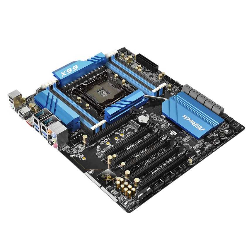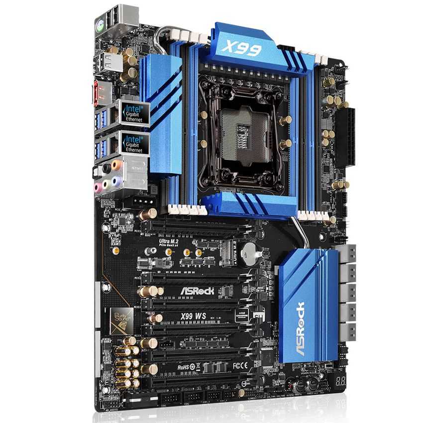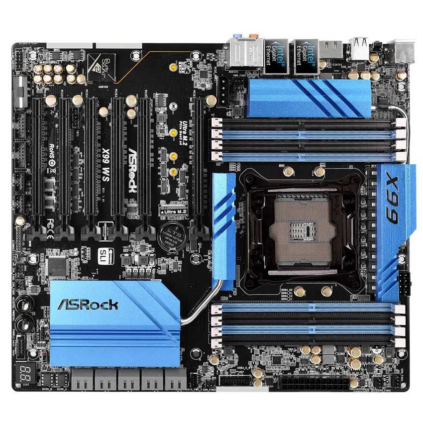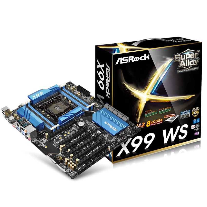 Descripción Asrock X99 WS. tipos de memoria compatibles: DDR4-SDRAM, Tipo de ranuras de memoria: DIMM, Soporte de canales de memoria: Quad. Familia de procesador: Intel, Procesador compatible: Core i7, Xeon, Socket de procesador: LGA 2011-v3. Interfaces de unidad de disco duro soportadas: Serial ATA III. Controlador LAN: Intel I210AT, Intel I217LM. Familia de componentes de tarjeta madre: Intel, Circuito integrado de tarjeta madre: Intel X99, Canales de salida de audio: 7.1