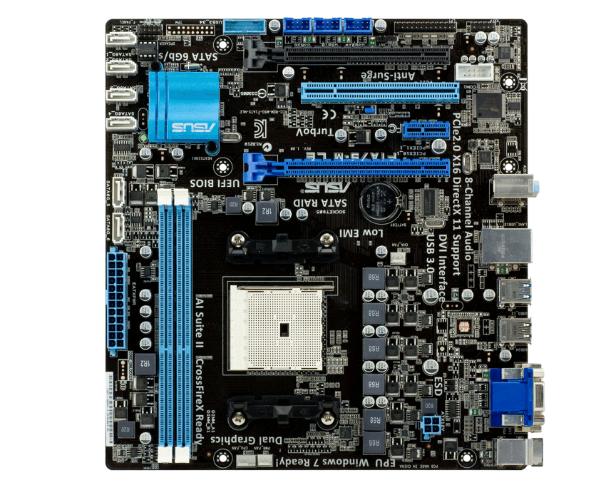 Non-ECC: YMemoria interna, máximo: 32 GBNúmero de ranuras DIMM: 2Supported DIMM module capacities: 1GB, 2GB, 4GB, 8GB, 16GBSupported memory clock speeds: 1066, 1333, 1600, 1866 MHztipos de memoria soportados: DDR3Memory channels support: dualFamilia de procesador: AMDProcesador socket: Socket FM1Máx.número de procesador SMP: 1Conector para ventilador: YUSB 2.0, conectores: 3S/PDIF, conector de salida: YConector de ventilador CPU: YNúmero de conectores COM: 1Potencia de conector ATX (24-pin): YChasis, número de conectores de ventilador: 1Número de conectores paralelos ATA: 0Conector de cable frontal de audio: YNumber of SATA 3 connectors: 6Peripheral (Molex) power connectors (4-pin): 1USB 3.0 connectors: 1Puerto de ratón PS/2: 2Cantidad de puertos USB 2.0: 4IEEE 1394/Firewire cantidad de puertos: 0Ethernet LAN (RJ-45) cantidad de puertos: 1Altavoz/ auricular / line-out jack: 3Cantidad de puertos VGA (D-Sub): 1Cantidad de puetos eSATA: 0Cantidad de puertos DVI-D: 1Candidad de puertos HDMI: 0Cantidad de puertos USB 3.0: 0Placa madre, factor de forma: micro ATXPlaca madre chipset: AMD A75Cables incluidos: SATASoporte para proceso paralelo: Interferencia cruzadaOverclocking características: ASUS C.P.R.(CPU Parameter Recall)Uso adecuado: PCSistema de sonido: Realtek ALC 887Audio output channels: 7.1PCI Express x16 slots: 2PCI slots: 1PCI Express x1 slots: 1PCI Express slots version: 2.0Ancho: 244 mmProfundidad: 229 mmTipo de controlador de interfaz: AMD A75Niveles RAID: 0, 1, 10, JBODControlador LAN: Realtek 8111EEthernet interface type: GigabitAdaptador de vídeo integrado (UMA/GMA): YFamilia del adaptador gráfico: AMDAdaptador gráfico: Radeon HD 6000Software incluido: ASUS PC Probe II\nASUS UpdateTrial software: Anti-virusDrivers included: YGuía de instalación rápida: YTipos de BIOS: AMIBIOS, tamaño de memoria: 32 MBACPI version: 2.0aSistemas operativos compatibles: -