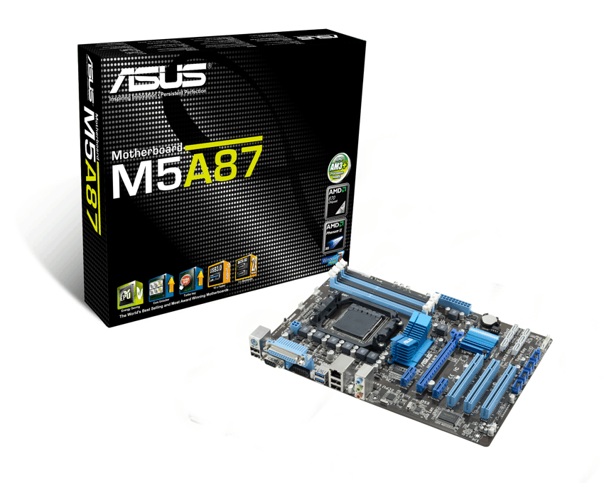 Asus M5A87, 16 GB, 2000, 1066, 1333, 1600 MHz, DDR3, dual, AMD, Socket AM3 Asus M5A87. Memoria: 16 GB, 2000, 1066, 1333, 1600 MHz, DDR3, dual. Procesador: AMD, Socket AM3, Phenom II X6, Phenom II X4, Phenom II X2, Athlon II X4, Athlon II X3, Athlon II X2, Athlon FX. Audio: ALC887, 7.1. Ranuras de expansión: 2.0. Peso y dimensiones: 305 mm, 213 mm. Reguladores del almacenaje: 0, 1, 5, 10, JBOD. Red: Realtek 8111E, Gigabit. Sistema operativo/software: ASUS utilities ASUS Update, Antivirus. BIOS: AMI, 16 MB, 2.0a