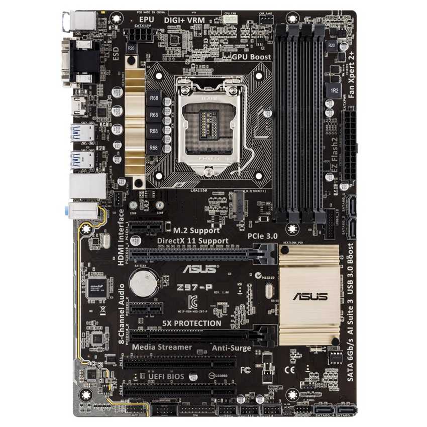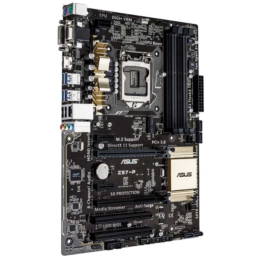 Especificaciones CPU: - Intel® Socket 1150 for the 5th/New 4th/4th Generation Core? i7/Core? i5/Core? i3/Pentium®/Celeron® Processors - Supports Intel® 22 nm CPU - Supports Intel® Turbo Boost Technology 2.0 Chipset: Intel® Z97 Memory: - 4 x DIMM, Max. 32GB, DDR3 3200(O.C.)/3100(O.C.)/3000(O.C.)/2933(O.C.)/2800(O.C.)/2666(O.C.)/2600(O.C.)/2400(O.C.)/2250(O.C.)/2200(O.C.)/2133(O.C.)/2000(O.C.)/1866(O.C.)/1600/1333 MHz Non-ECC, Un-buffered Memory * - Dual Channel Memory Architecture - Supports Intel® Extreme Memory Profile (XMP) Graphic: - Integrated Graphics Processor- Intel® HD Graphics support - Multi-VGA output support : HDMI/DVI-D/RGB ports - Supports HDMI with max. resolution 4096 x 2160 @ 24 Hz / 2560 x 1600 @ 60 Hz - Supports DVI-D with max. resolution 1920 x 1200 @ 60 Hz - Supports RGB with max. resolution 1920 x 1200 @ 60 Hz - Maximum shared memory of 512 MB - Supports Intel® InTru? 3D, Quick Sync Video, Clear Video HD Technology, Insider? - Supports up to 3 displays simultaneously Expansion Slots: - 1 x PCIe 3.0/2.0 x16 (x16 mode, gray) - 1 x PCIe 2.0 x16 (x2 mode, black) - 2 x PCIe x1 - 2 x PCI Storage: - 1 x M.2 Socket 3, , with M Key, type 2260/2280 storage devices support (both SATA & PCIE mode)*1 - 4 x SATA 6Gb/s port(s), gray - Support Raid 0, 1, 5, 10 - Supports Intel® Smart Response Technology, Intel® Rapid Start Technology, Intel® Smart Connect Technology *1 LAN: Realtek® 8111GR, 1 x Gigabit LAN Controller(s) Audio: Realtek® ALC891 8-Channel High Definition Audio CODEC USB Ports: - Intel® Z97 chipset: 6 x USB 3.0/2.0 port(s) (4 at back panel, blue, 2 at mid-board) - Intel® Z97 chipset: 8 x USB 2.0/1.1 port(s) (2 at back panel, black, 6 at mid-board) Back I/O Ports: - 1 x PS/2 keyboard (purple) - 1 x PS/2 mouse (green) - 1 x DVI-D - 1 x D-Sub - 1 x HDMI - 1 x LAN (RJ45) port(s) - 4 x USB 3.0 (blue) - 2 x USB 2.0 - 3 x Audio jack(s) Form Factor: ATX