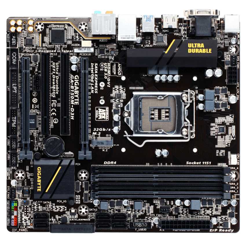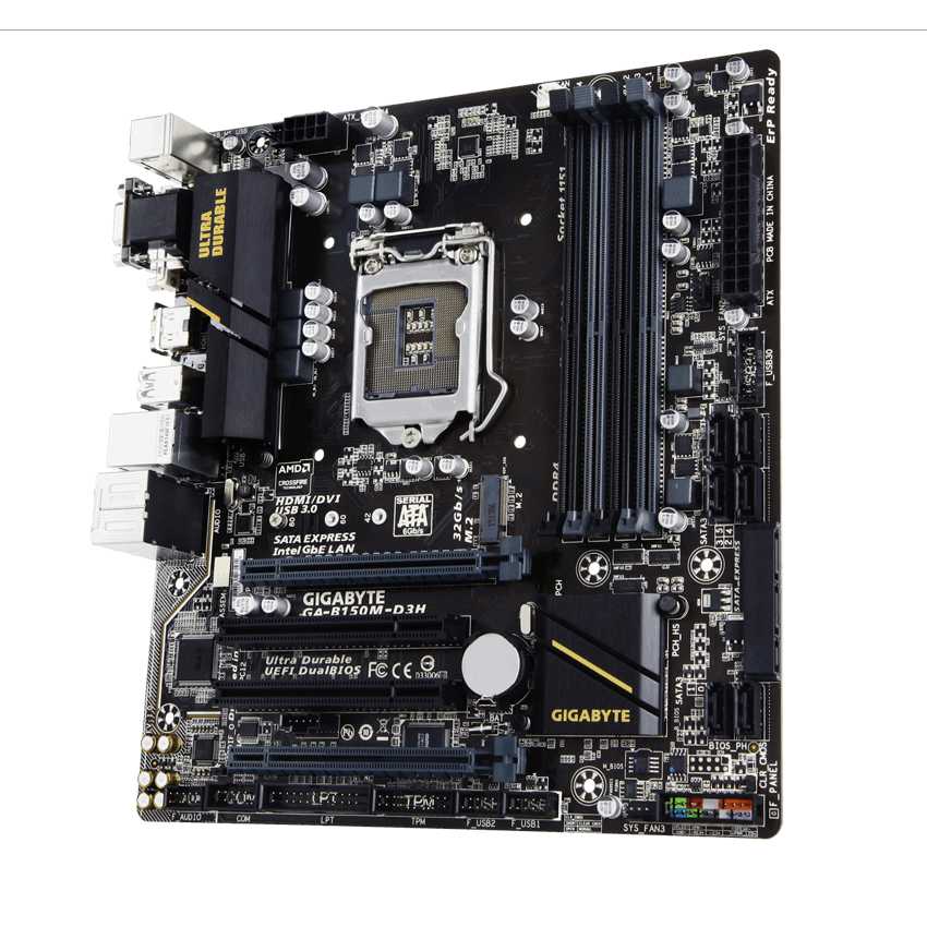 Especificaciones CPU: - Support for Intel® Core? i7 processors/Intel® Core? i5 processors/ Intel® Core? i3 processors/Intel® Pentium® processors/ Intel® Celeron® processors in the LGA1151 package - L3 cache varies with CPU Chipset: Intel® B150 Express Chipset Memory: - 4 x DDR3 DIMM sockets supporting up to 32 GB of system memory - Dual channel memory architecture - Support for DDR3/DDR3L 1866(OC)/1600/1333 MHz memory modules - Support for ECC UDIMM 1Rx8/2Rx8 memory modules (operate in non-ECC mode) - Support for non-ECC UDIMM 1Rx8/2Rx8 memory modules Onboard Graphics. Integrated Graphics Processor-Intel® HD Graphics support: - 1 x D-Sub port, supporting a maximum resolution of 1920x1200@60 Hz - 1 x DVI-D port, supporting a maximum resolution of 1920x1200@60 Hz - 1 x HDMI port, supporting a maximum resolution of 4096x2160@24 Hz - Support for up to 3 displays at the same time - Maximum shared memory of 512 MB Audio: - Realtek® ALC892 codec - High Definition Audio - 2/4/5.1/7.1-channel - Support for S/PDIF Out LAN: Intel® GbE LAN chip (10/100/1000 Mbit) Expansion Slots : - 1 x PCI Express x16 slot, running at x16 (PCIEX16) - 1 x PCI Express x16 slot, running at x4 (PCIEX4) - 2 x PCI slots Multi-Graphics Technology: Support for 2-Way AMD CrossFire? technology Storage Interface. Chipset: - 1 x M.2 Socket 3 connector - 1 x SATA Express connector - 6 x SATA 6Gb/s connectors USB. Chipset: - 6 x USB 3.0/2.0 ports (4 ports on the back panel, 2 ports available through the internal USB header) - 6 x USB 2.0/1.1 ports (2 ports on the back panel, 4 ports available through the internal USB headers) Internal I/O Connectors - 1 x 24-pin ATX main power connector - 1 x 8-pin ATX 12V power connector - 1 x M.2 Socket 3 connector - 1 x SATA Express connector - 6 x SATA 6Gb/s connectors - 1 x CPU fan header - 3 x system fan headers - 1 x front panel header - 1 x front panel audio header - 1 x S/PDIF Out header - 1 x USB 3.0/2.0 header - 2 x USB 2.0/1.1 headers - 1 x Trusted Platform Module (TPM) header - 1 x Thunderbolt? add-in card connector - 1 x serial port header - 1 x parallel port header - 1 x Clear CMOS jumper Back Panel Connectors: - 1 x PS/2 keyboard/mouse port - 1 x D-Sub port - 1 x DVI-D port - 1 x HDMI port - 4 x USB 3.0/2.0 ports - 2 x USB 2.0/1.1 ports - 1 x RJ-45 port - 6 x audio jacks (Center/Subwoofer Speaker Out, Rear Speaker Out, Side Speaker Out, Line In, Line Out, Mic In) I/O Controller: iTE® I/O Controller Chip H/W Monitoring: - System voltage detection - CPU/System temperature detection - CPU/System fan speed detection - CPU/System overheating warning - CPU/System fan fail warning - CPU/System fan speed control BIOS: - 2 x 128 Mbit flash - Use of licensed AMI UEFI BIOS - Support for DualBIOS? - PnP 1.0a, DMI 2.7, WfM 2.0, SM BIOS 2.7, ACPI 5.0 Unique Features: - Support for APP Center - Support for Q-Flash - Support for Smart Switch - Support for Xpress Install Bundle Software: - Norton® Internet Security (OEM version) - Intel® Small Business Advantage - cFosSpeed Operating System: Support for Windows 10/8.1/7* Form Factor: Micro ATX Form Factor; 24.4cm x 22.5cm