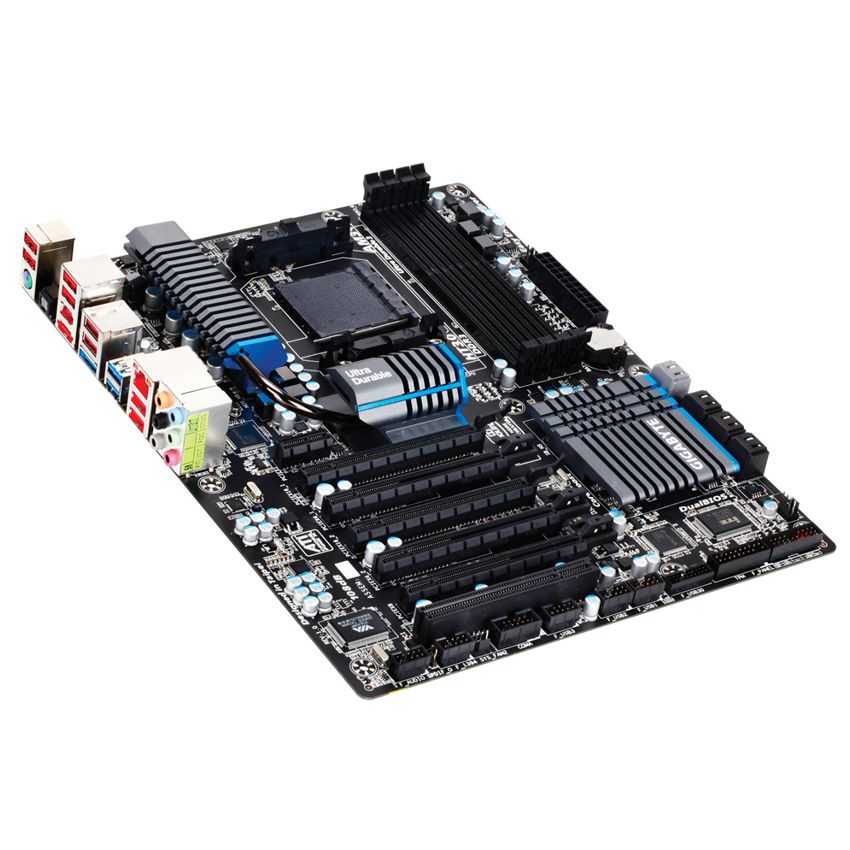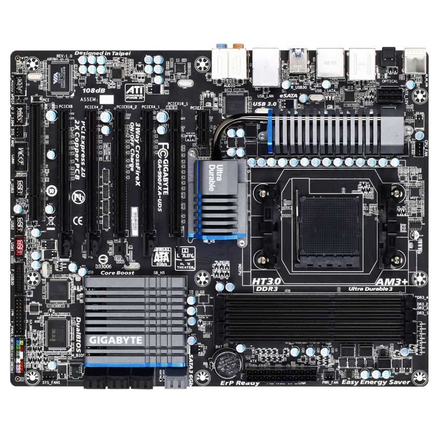 Descripción - Soporta la nueva serie AM3+ FX/AM3 Phenom? II de procesadores de AMD - AMD SB950 proporciona 6 puertos SATA3 nativos a una velocidad de 6Gbps y soporte de RAID 0, 1, 5 y 10 - 5 interfaces PCI-E 2.0 con soporte para varias pantallas con 3way AMD CrossFireX y SLI - 3 puertos USB con la tecnología On/Off Charge de GIGABYTE - Soporta USB 3.0 con tasas de transferencia de hasta 5 Gbps - Soport audio Dolby Home Theater - Reproducción de Blu-ray y DVD de alta definición con una relación señal a ruido de 108dB - Diseño revolucionario en cuanto a ahorro de energía gracias a la tecnología Easy Energy Saver - Tecnología Ultra Durable? 3 con refrigeración de alta calidad con cobre para una menor temperatura de funcionamiento - Diseño avanzado de potencia del VRM de la CPU con 8+2 fases con soporte para las CPUs high-TDP de AMD - La tecnología Turbo XHD permite mejorar el rendimiento del disco duro con facilidad - Soporte de discos duros de hasta 3TB gracias a la tecnología Hybrid EFi incluida en nuestra patentada DualBIOS