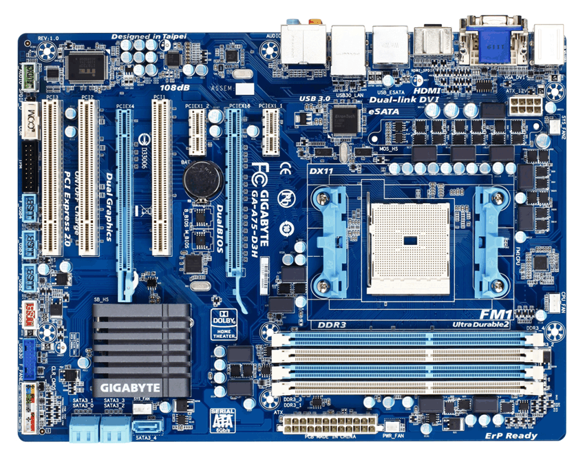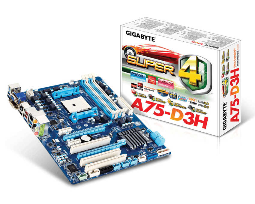 Gigabyte GA-A75-D3H Supports Socket FM1 of 32nm AMD A-series/E2-series processors Enhanced AMD Radeon HD 65xx/64xx/63xx graphics (DX11) integrated with the processor 2 PCI-E 2.0 interfaces with AMD Dual Graphics and CrossFireX technology support Ultra Durable 2 Classic Technology with 4+1 phase power VRM designed Supports 6 USB 3.0 interfaces with superfast transfer rates of up to 5Gbps Supports 6 SATA3 storage interfaces with superfast 6Gbps link speed and RAID 0,1,10 GIGABYTE 3x USB Power with On/Off Charge USB ports Integrated HDMI/Dual-link DVI/D-sub outputs for high resolution up to 2560x1600 Full HD playback Hi-def 108dB Signal-to-noise ratio Blu-ray DVD audio playback Patented DualBIOS with Hybrid EFI technology for 3TB HDD support Supports Dolby Home Theater audio