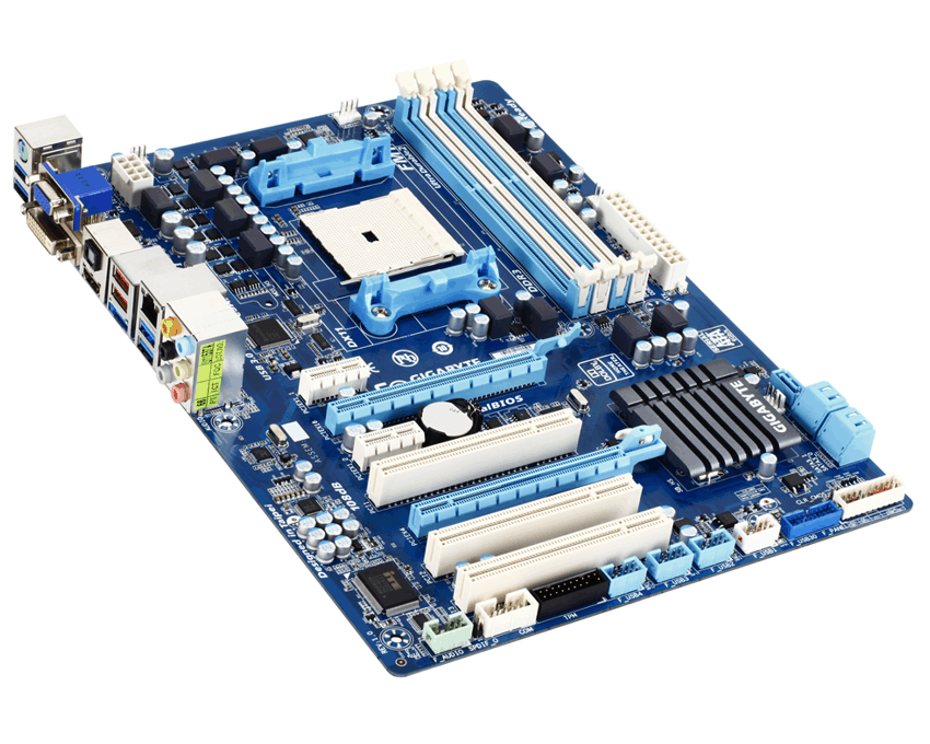 APUFM1 Socket: AMD A series & E2 series processors Chipset: AMD A75 chipset Memory 4 x 1.5V DDR3 DIMM sockets supporting up to 32 GB of system memory (Note 1) Dual channel memory architecture Support for DDR3 1866/1600/1333/1066 MHz memory modules (Note 2) (Please refer "Memory Support List" for more information.) Onboard GraphicsAPU: 1 x D-Sub port 1 x DVI-D port, supporting a maximum resolution of 2560x1600 (Note 3) (Note 4) 1 x HDMI port, supporting a maximum resolution of 1920x1200 (All integrated graphics ports do not support Hot plug. If you want to change to another graphics port when the computer is on, be sure to turn off the computer first.) Audio Realtek ALC889 codec High Definition Audio 2/4/5.1/7.1-channel Support for Dolby® Home Theater Support for S/PDIF Out LAN 1 x Realtek RTL8111E chip (10/100/1000 Mbit) Expansion Slots 1 x PCI Express x16 slot, running at x16 (PCIEX16) (Note 5) 1 x PCI Express x16 slot, running at x4 (PCIEX4) 2 x PCI Express x1 slots (All PCI Express slots conform to the PCI Express 2.0 standard.) 3 x PCI slots Multi-Graphics Technology Support for AMD Dual Graphics technology Only A series APU support AMD Dual Graphics. Support for AMD CrossFireX technology Storage InterfaceChipset: 5 x SATA 6Gb/s connectors supporting up to 5 SATA 6Gb/s devices 1 x eSATA 6Gb/s port on the back panel supporting up to 1 SATA 6Gb/s device (Note 6) Support for RAID 0, RAID 1, RAID 10, and JBOD USBChipset: Up to 10 USB 2.0/1.1 ports (2 ports on the back panel, 8 ports available through the internal USB headers) Up to 4 USB 3.0/2.0 ports (2 ports on the back panel, 2 ports available through the internal USB header) Etron EJ168 chips: Up to 2 USB 3.0/2.0 ports on the back panel Internal I/O Connectors 1 x 24-pin ATX main power connector 1 x 8-pin ATX 12V power connector 5 x SATA 6Gb/s connectors 1 x APU fan header 2 x system fan headers 1 x power fan header 1 x front panel header 1 x front panel audio header 1 x S/PDIF Out header 4 x USB 2.0/1.1 headers 1 x USB 3.0/2.0 header 1 x serial port header 1 x Trusted Platform Module (TPM) header 1 x clearing CMOS jumper Back Panel Connectors 1 x PS/2 keyboard/mouse port 1 x D-Sub port 1 x DVI-D port 1 x HDMI port 1 x optical S/PDIF Out connector 2 x USB 2.0/1.1 ports 4 x USB 3.0/2.0 ports 1 x eSATA 6Gb/s port 1 x RJ-45 port 6 x audio jacks (Center/Subwoofer Speaker Out/Rear Speaker Out/Side Speaker Out/Line In/Line Out/Microphone) I/O Controller iTE IT8720 chip H/W Monitoring System voltage detection APU/System temperature detection APU/System/Power fan speed detection APU overheating warning APU/System/Power fan fail warning APU/System fan speed control (Note 7) BIOS 2 x 32 Mbit flash Use of licensed AWARD BIOS Support for DualBIOS™ PnP 1.0a, DMI 2.0, SM BIOS 2.4, ACPI 1.0b Unique Features Support for @BIOS Support for Q-Flash Support for Xpress BIOS Rescue Support for Download Center Support for Xpress Install Support for Xpress Recovery2 Support for EasyTune (Note 8) Support for Smart Recovery Support for Auto Green Support for ON/OFF Charge Support for 3TB+ Unlock Support for Q-Share Bundle Software Norton Internet Security (OEM version) Operating System Support for Microsoft® Windows 7/Vista/XP Form Factor ATX Form Factor; 30.5cm x 22.5cm