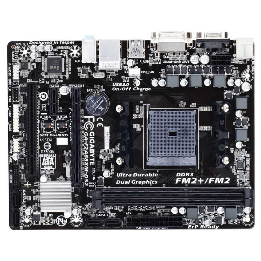 Descripción Gigabyte GA-F2A88XM-DS2. tipos de memoria compatibles: DDR3-SDRAM, Tipo de ranuras de memoria: DIMM, Soporte de canales de memoria: Dual. Familia de procesador: AMD, Procesador compatible: AMD A, Athlon, Socket de procesador: Socket FM2+. Interfaces de unidad de disco duro soportadas: SATA, Serial ATA II, Serial ATA III. Tipo de interfaz ethernet: Gigabit. Componente para: PC, Familia de componentes de tarjeta madre: AMD, Circuito integrado de tarjeta madre: AMD A88X