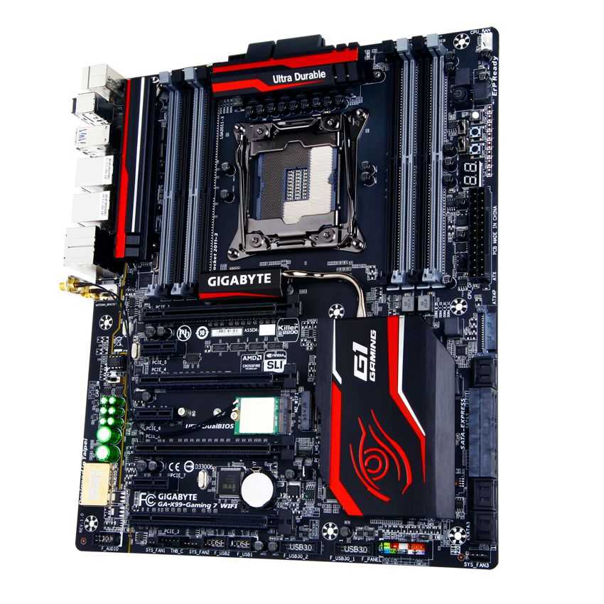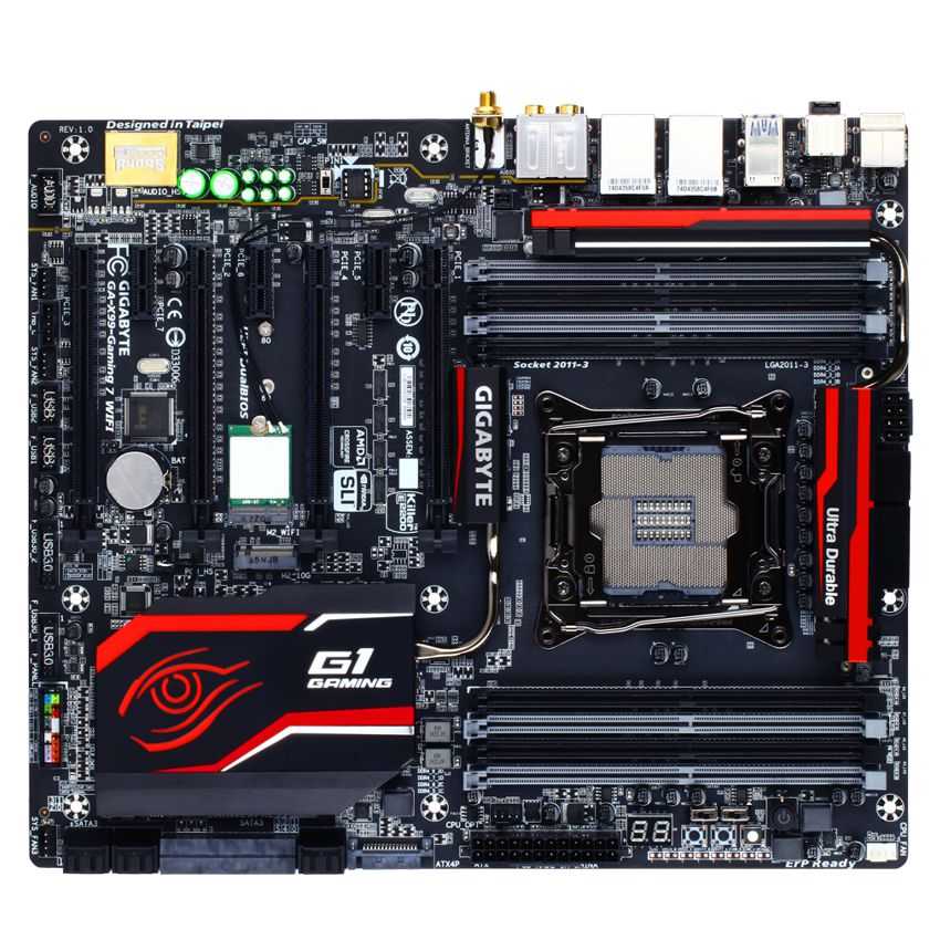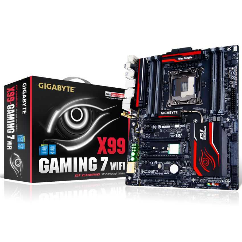 Descripción Gigabyte GA-X99-GAMING 7 WIFI. tipos de memoria compatibles: DDR4-SDRAM, Tipo de ranuras de memoria: DIMM, Soporte de canales de memoria: Quad. Familia de procesador: Intel, Procesador compatible: Core i7, Core i7 Extreme Edition, Socket de procesador: LGA 2011-v3. Interfaces de unidad de disco duro soportadas: SATA, Serial ATA II, Serial ATA III. Controlador LAN: Intel I218V, Tipo de interfaz ethernet: Gigabit, Wi-Fi estándars: 802.11a, 802.11ac, 802.11b, 802.11g, 802.11n. Componente para: PC, Familia de componentes de tarjeta madre: Intel, Circuito integrado de tarjeta madre: Intel X99