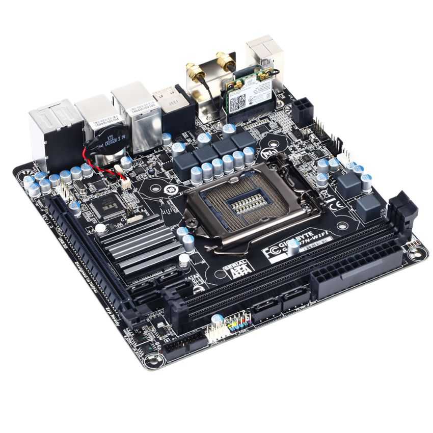 DescripciónGigabyte GA-Z97N-WIFI. tipos de memoria compatibles: DDR3-SDRAM, Tipo de ranuras de memoria: DIMM, Canales de memoria: Dual. Familia de procesador: Intel, Procesador compatible: Celeron, Core i3, Core i5, Core i7, Socket de procesador: Socket H3 (LGA 1150). Interfaces de unidad de disco duro soportadas: SATA. Versión HDMI: 1.4a. Wi-Fi estándares: 802.11a, 802.11ac, 802.11b, 802.11g, 802.11n, Versión de Bluetooth: 4.0Especificacionestipos de memoria compatibles: DDR3-SDRAMTipo de ranuras de memoria: DIMMCanales de memoria: DualNo ECC: SiVelocidades de reloj de memoria soportadas: 1333, 1600 MHzMemoria interna máxima: 16 GBRanuras de memoria: 2Familia de procesador: IntelProcesador compatible: Celeron, Core i3, Core i5, Core i7Socket de procesador: Socket H3 (LGA 1150)USB 2.0, conectores: 1Conectores USB 3.0: 1Interfaces de unidad de disco duro soportadas: SATANúmero de conectores SATA: 6S/PDIF, conector de salida: SiConector de ventilador CPU: SiConector de potencia ATX (24 pines): SiConector de instrusión a chasis: SiConector de audio en panel frontal: SiCabecera de puerto serie: 1Cantidad de puertos USB 2.0: 2Cantidad de puertos USB 3.0: 4Ethernet LAN (RJ-45) cantidad de puertos: 2Puerto de ratón PS/2: 1Salidas para auriculares: 5Micrófono, jack de entrada: SiPuerto de salida S/PDIF: SiNúmero de puertos HDMI: 2Cantidad de puertos DVI-I: 1Versión HDMI: 1.4aEthernet: SiWifi: SiBluetooth: SiWi-Fi estándares: 802.11a, 802.11ac, 802.11b, 802.11g, 802.11nVersión de Bluetooth: 4.0Componente para: PCFamilia de componentes de tarjeta madre: IntelCircuito integrado de tarjeta madre: Intel Z97Tarjeta madre, factor de forma: Mini iTXCanales de salida de audio: 7.1Niveles RAID: 0, 1, 5, 10Sistema de audio: Realtek ALC892Sistema operativo Windows soportado: SiMemoria máxima de adaptador de gráficos: 1000 MBMáxima resolución: 4096 x 2160 PixelesRanuras x16 PCI Express: 1Entradas Mini PCI Express: 1Tipos de BIOS: UEFI AMIBIOS, tamaño de memoria: 64 MBVersión ACPI: 5.0Ancho: 17 cmProfundidad: 17 cmSoftware incluido: Norton Internet Security (OEM version) Intel Rapid Start Technology Intel Smart Connect Technology Intel Smart Response Technology Intel Wireless Display